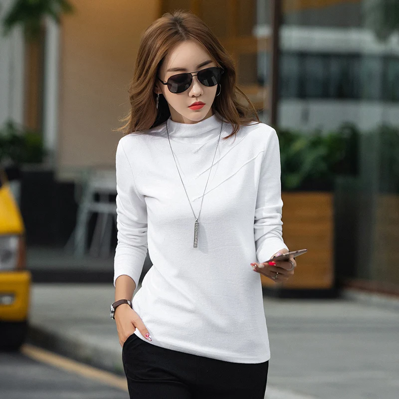 Special Offer Camiseta de cuello Semi Alto otoño mujer Camisetas de manga larga botones camisa de fondo sólido moda elegante señora Ropa Camisetas 6973 50 Discount 23% Today!