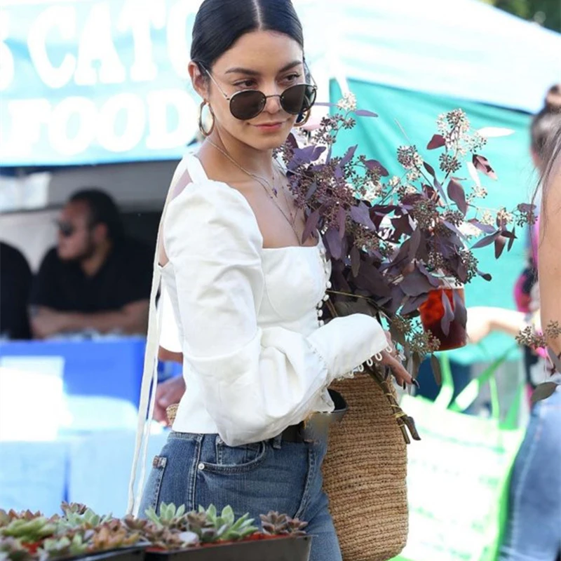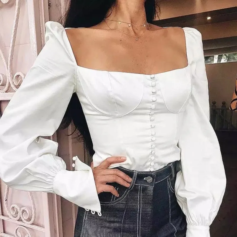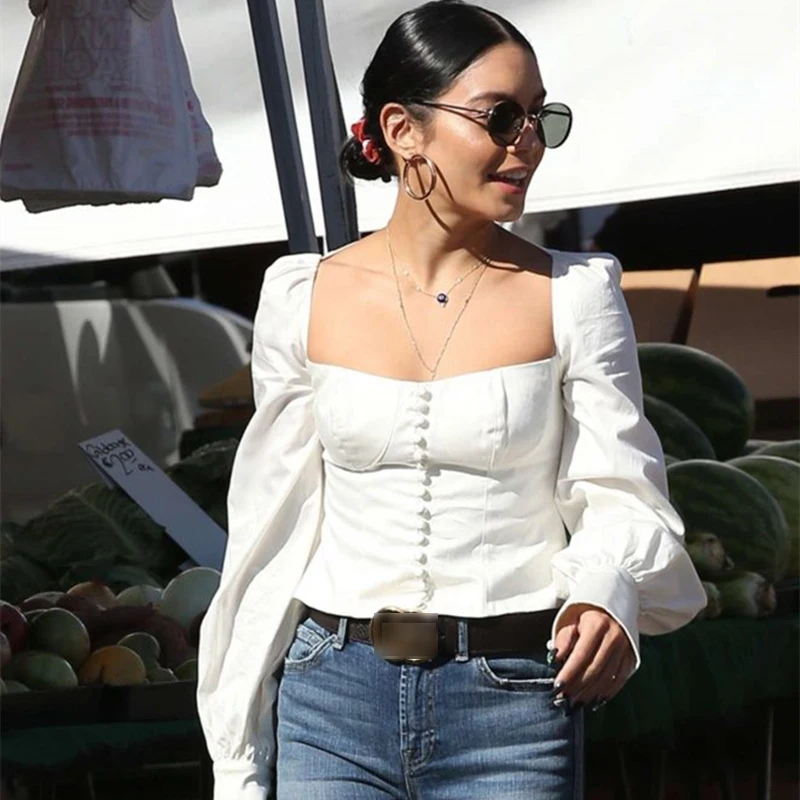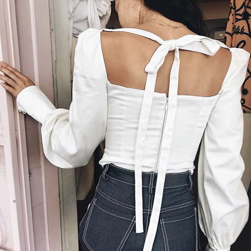 Special Offer LANMREM 2020 mujeres cuello cuadrado espalda descubierta manga larga linterna encaje up Bow camisa moda botón Primavera Verano Sexy tapas TB114 Discount 32% Today!