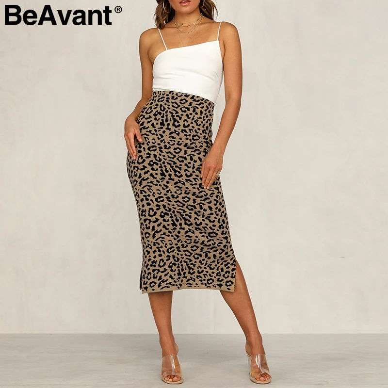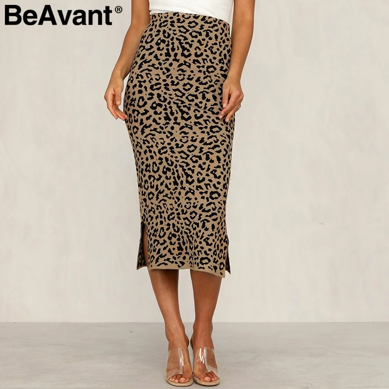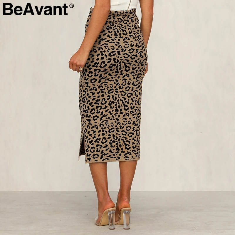 Special Offer BeAvant leopardo estampado de punto Mujer Falda midi de cintura alta suéter falda femenina Otoño Invierno ropa de fiesta señoras falda inferior Discount 40% Today!