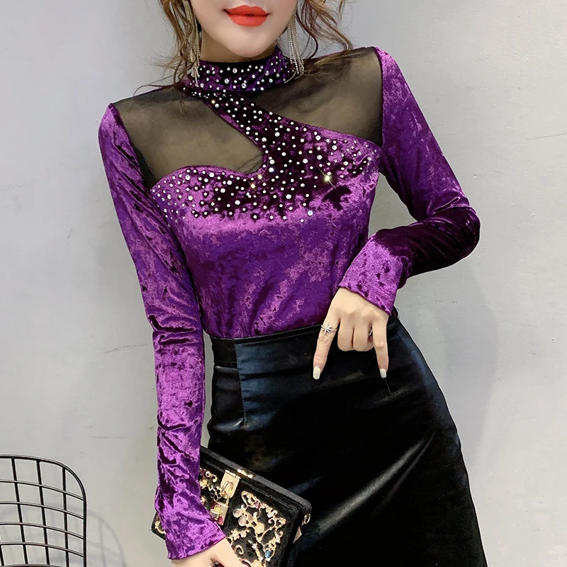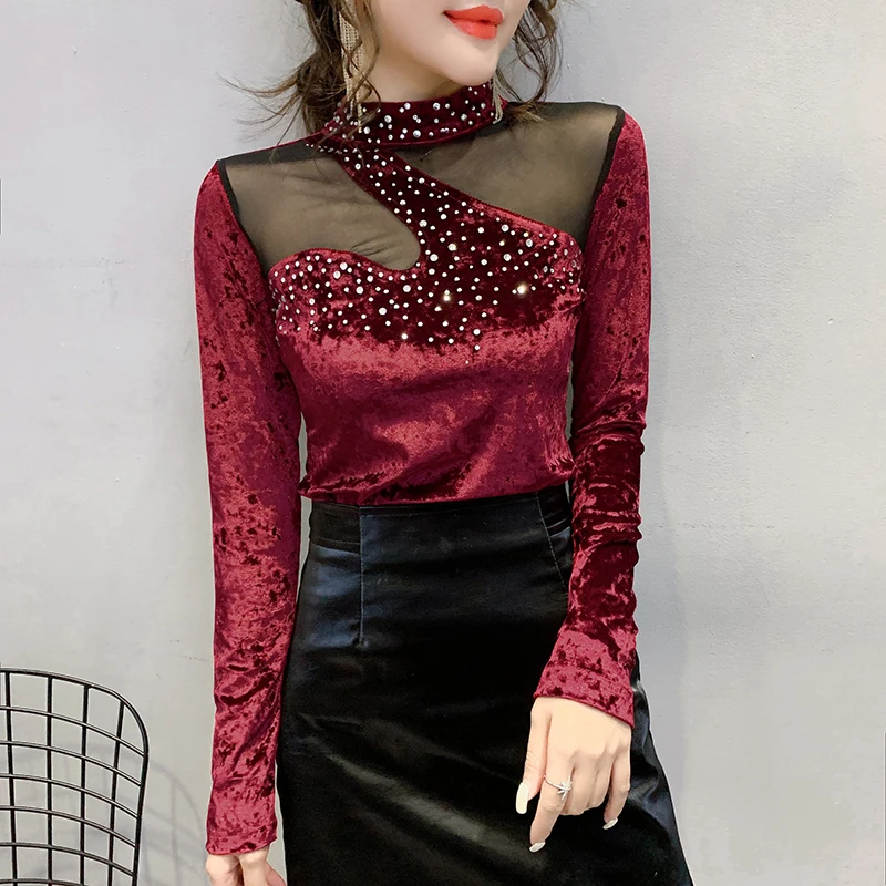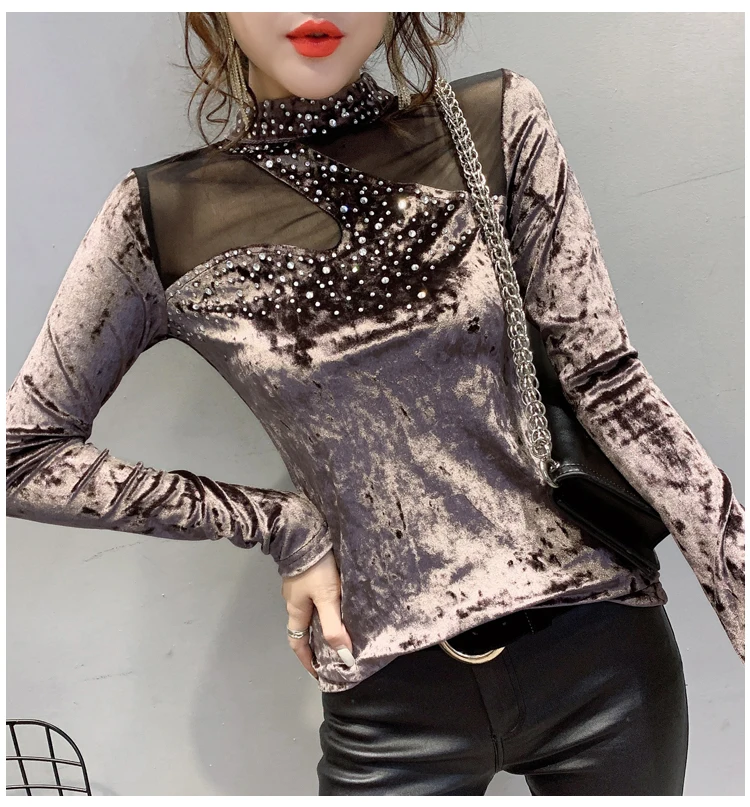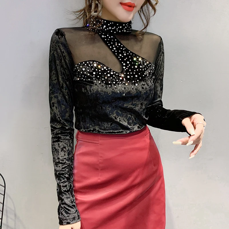 Special Offer Ropa coreana Sexy Patchwork malla camiseta diamantes nuevo Otoño Invierno mujeres flocado camisetas Ropa Mujer Bottoming Shirt camisetas T9N905 Discount 40% Today!