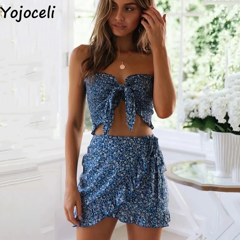 Special Offer Yojoceli Sexy arco volantes Vestido corto conjunto de dos piezas para mujeres verano elegante estampado floral playa vestido Casual vestido diario vestidos Discount 41% Today!