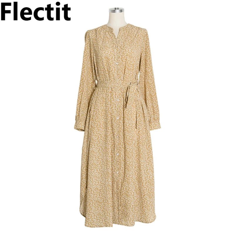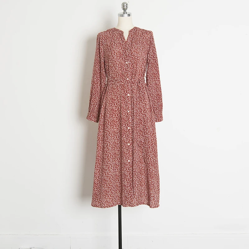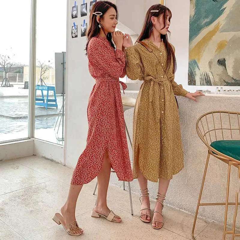 Special Offer Vestido Floral con botones cuello en V manga larga con lazo abertura lateral flor vestido Midi para mujer otoño Vintage francés Chic * Discount 51% Today!