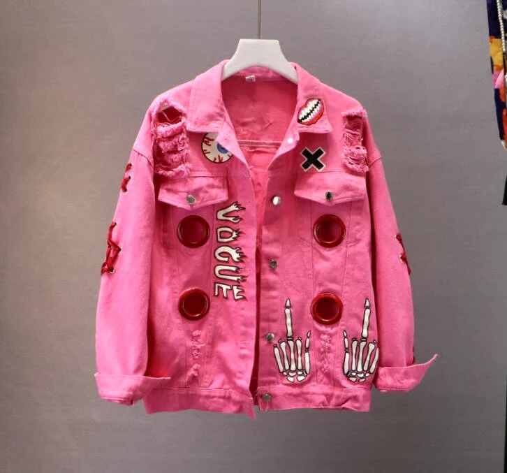 Special Offer Chaqueta vaquera roja amarilla nueva primavera otoño mujer alfabeto grafiti impresión encaje arco Pin agujero chaqueta vaquera estudiante capa básica Discount 15% Today!