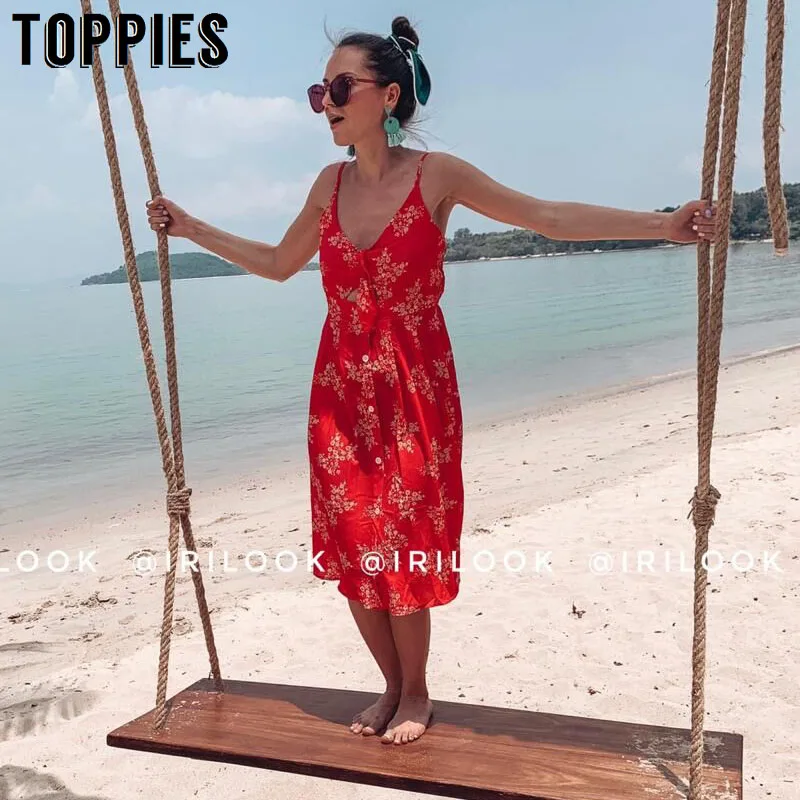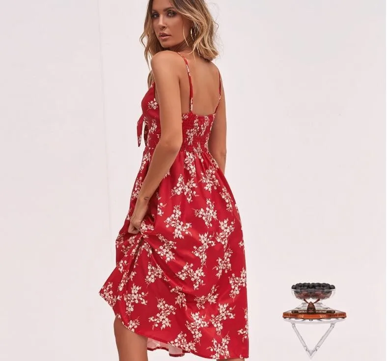 Special Offer Durante mucho tiempo, las mujeres vestido de estampado floral rojo camisolas vacaciones playa vestido de verano vestido frente arco nudo Sexy ropa con la espalda descubierta para las mujeres 2019 Discount 20% Today!