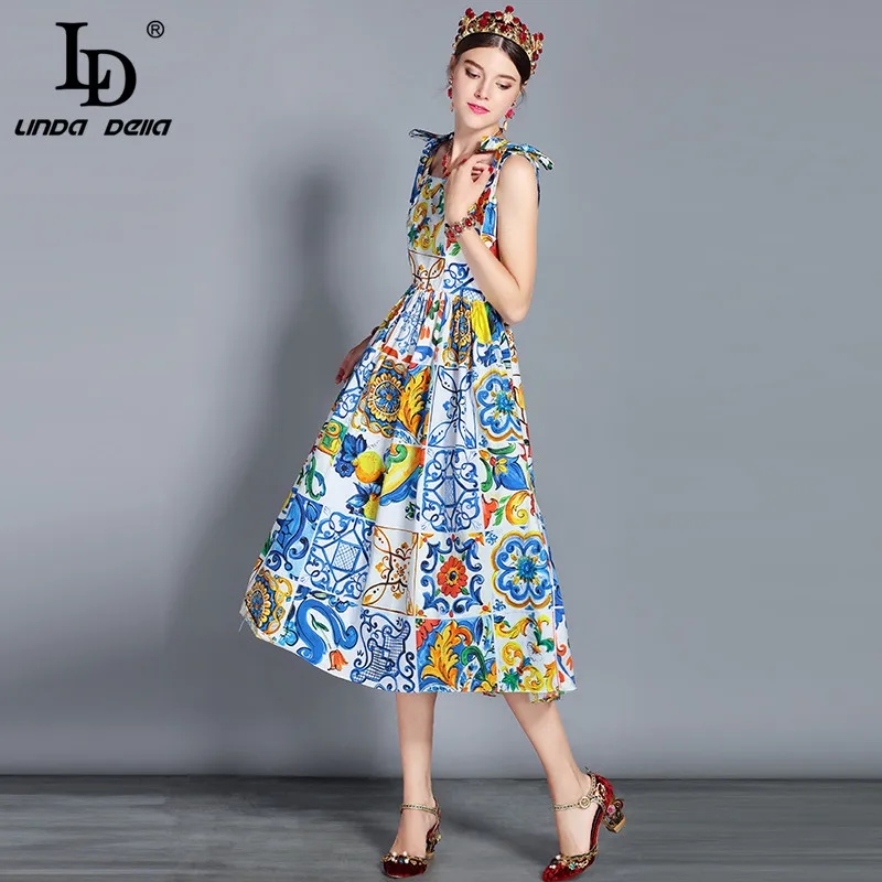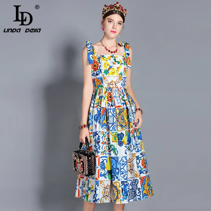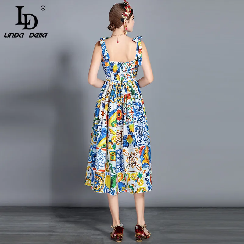 Special Offer LD LINDA del nuevo 2019 vestido de verano de la pista de la manera de las mujeres del arco de espagueti Correa precioso estampado Floral Midi vestido de algodón vestidos Discount 20% Today!