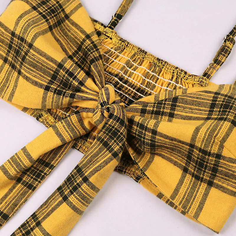 Special Offer InstaHot amarillo Plaid 2 piezas Set mujer verano fruncido volantes cintura elástica falda y arco Crop superior Sexy 2018 nuevo estilo mujer conjunto Discount 40% Today!