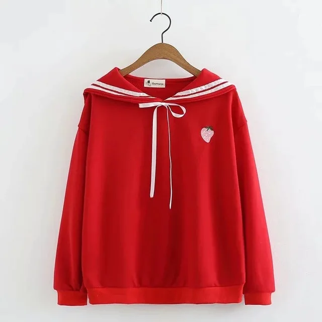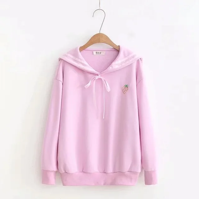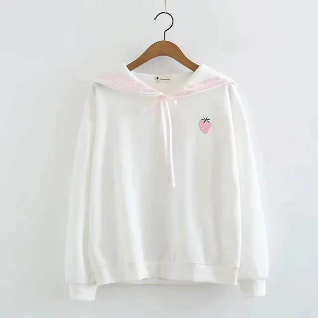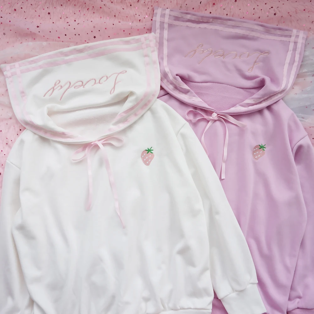 Special Offer Estilo Preppy japonés Kawaii chicas Linda fresa bordado Sailor Neck Hoodie coreano manga larga Bow sudadera Lolita camisetas Discount 13% Today!