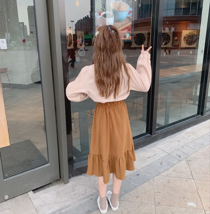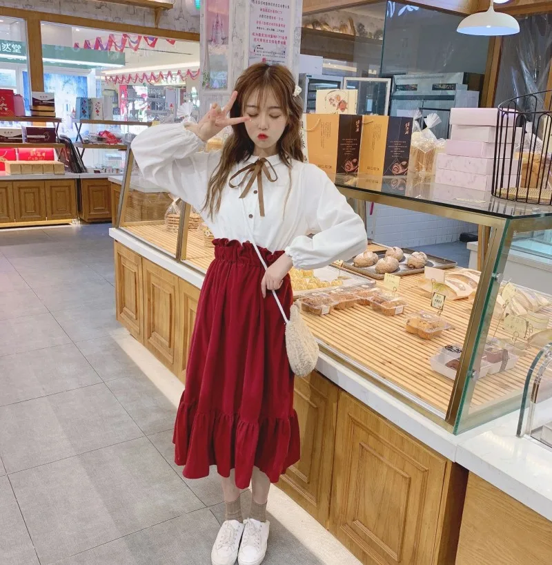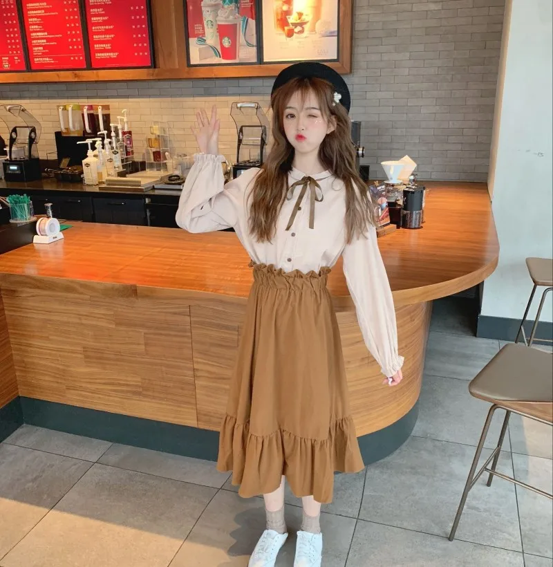 Special Offer Traje de dos piezas primavera mujer japonesa dulce Retro engrosamiento arco Camisa + falda de cintura alta moda Casual Streetwear Set Discount 15% Today!
