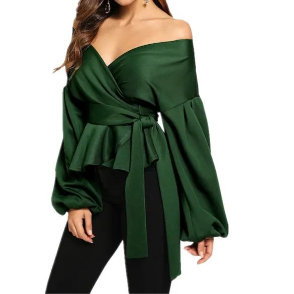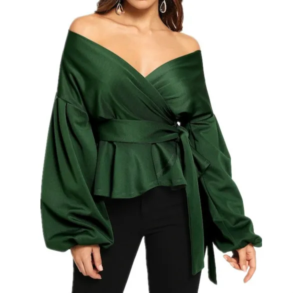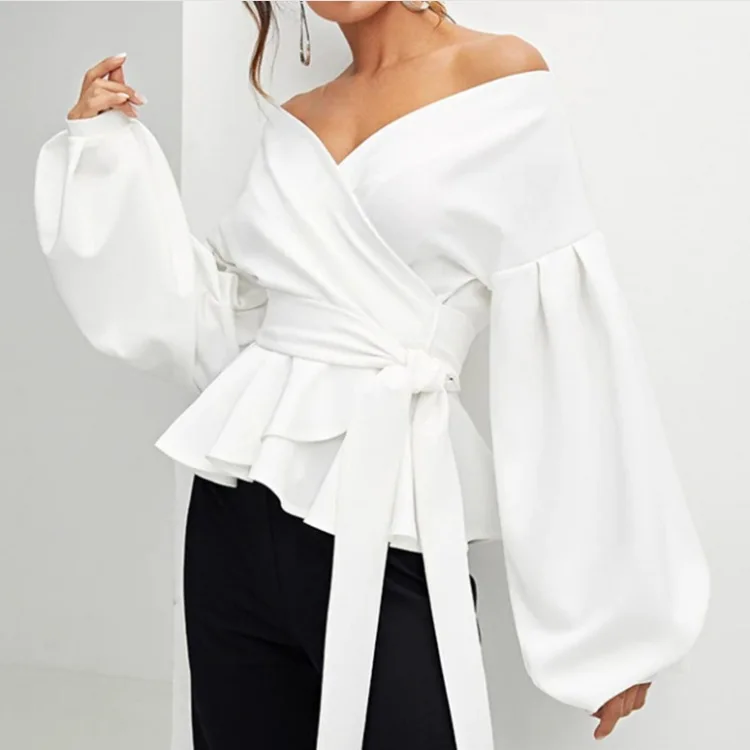 Special Offer Blanco Oficina señora elegante linterna manga Belted Peplum camisas de talla grande de hombro sólido blusa Sexy mujeres blusas Chemise Discount 20% Today!