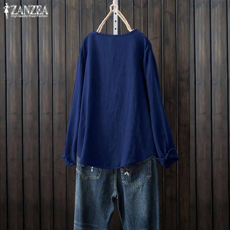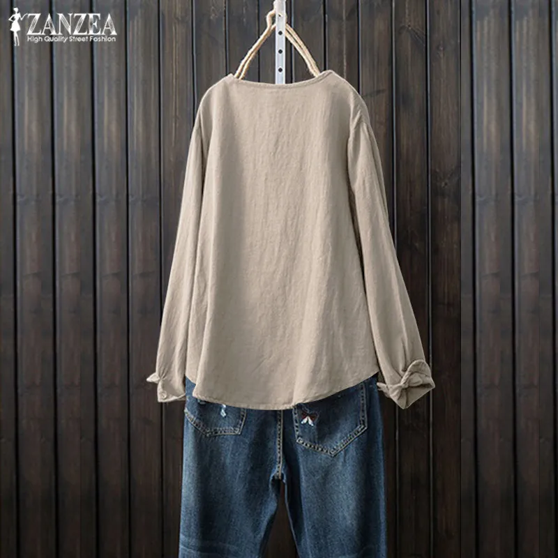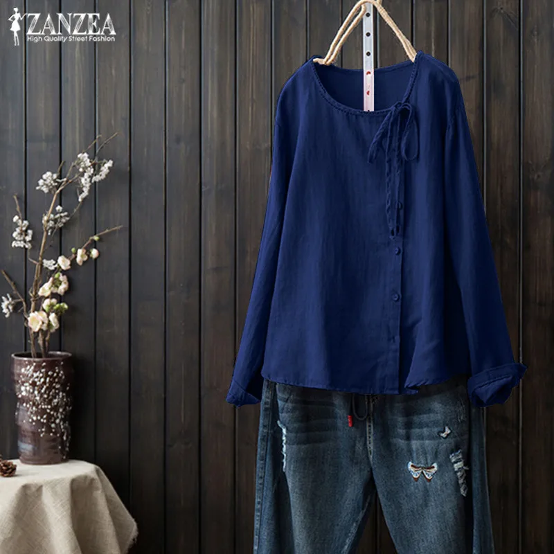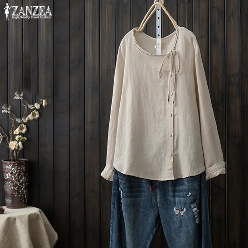 Special Offer Blusa de lino de talla grande para mujer Blusas túnica 2019 camisas de manga larga ZANZEA botón femenino encaje Casual Blusas camisa sólida Discount 40% Today!