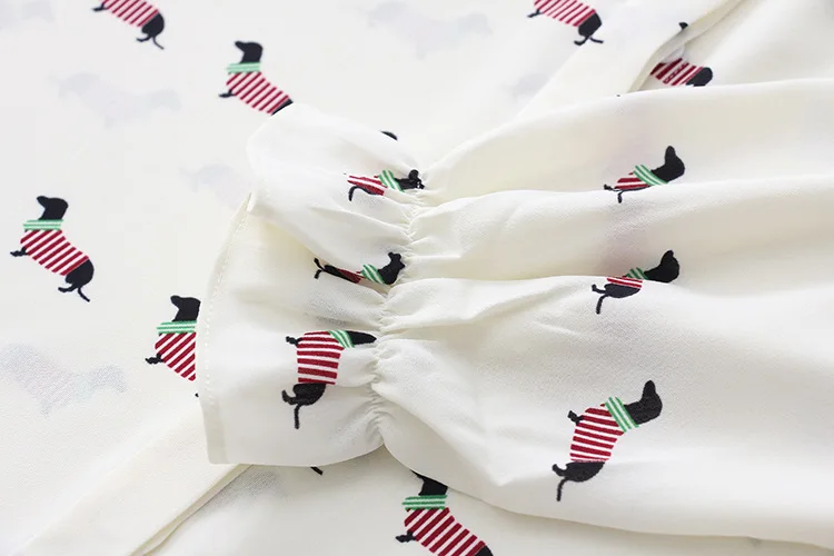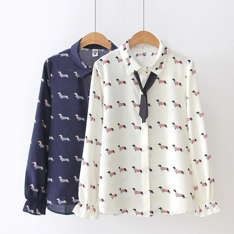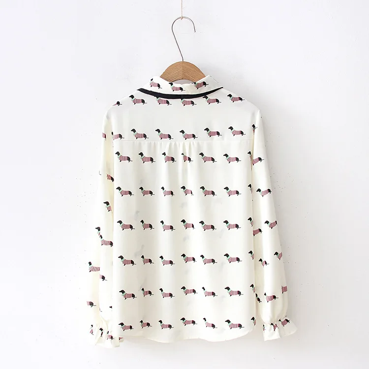 Special Offer Lindo estampado de Teckel gasa para mujer camisa estilo Preppy perro estampado cuello vuelto Bowtie Flare manga primavera otoño T83701 Discount 40% Today!
