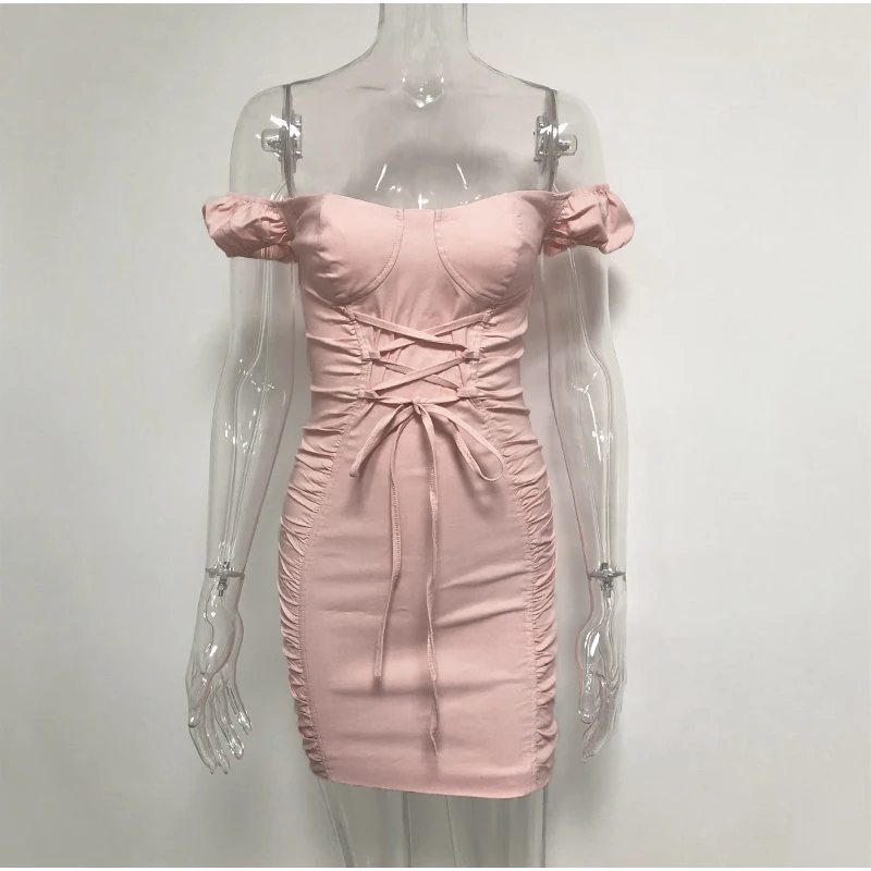 Special Offer NewAsia Puff manga vestido de fiesta de verano de las mujeres de hombro Sexy vestido ceñido corsé de encaje apretado Mini vestido fruncido vestidos rosa Discount 45% Today!