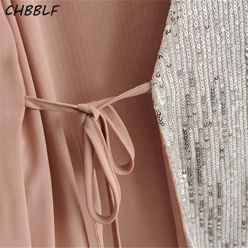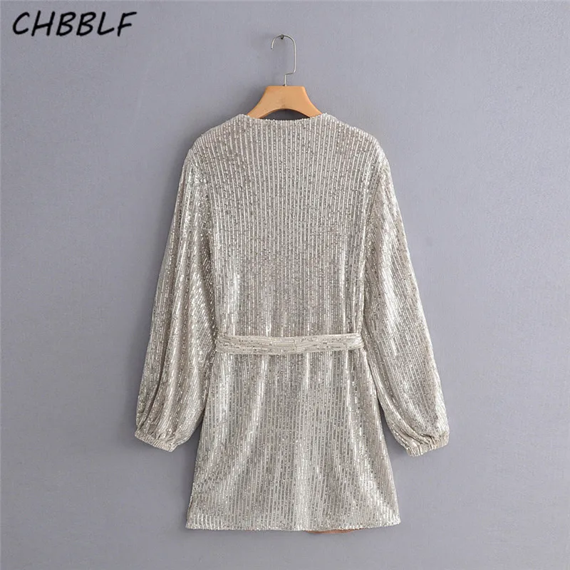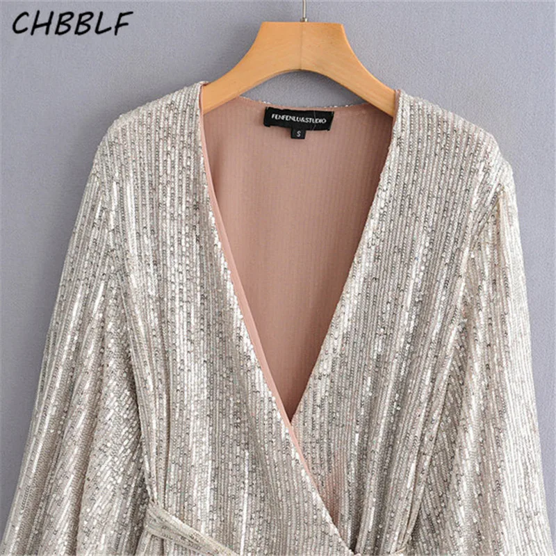 Special Offer CHBBLF Mujer parte lentejuelas mini vestido cruzado cuello pico pajarita manga larga vestidos femeninos ZSZ390 Discount 15% Today!
