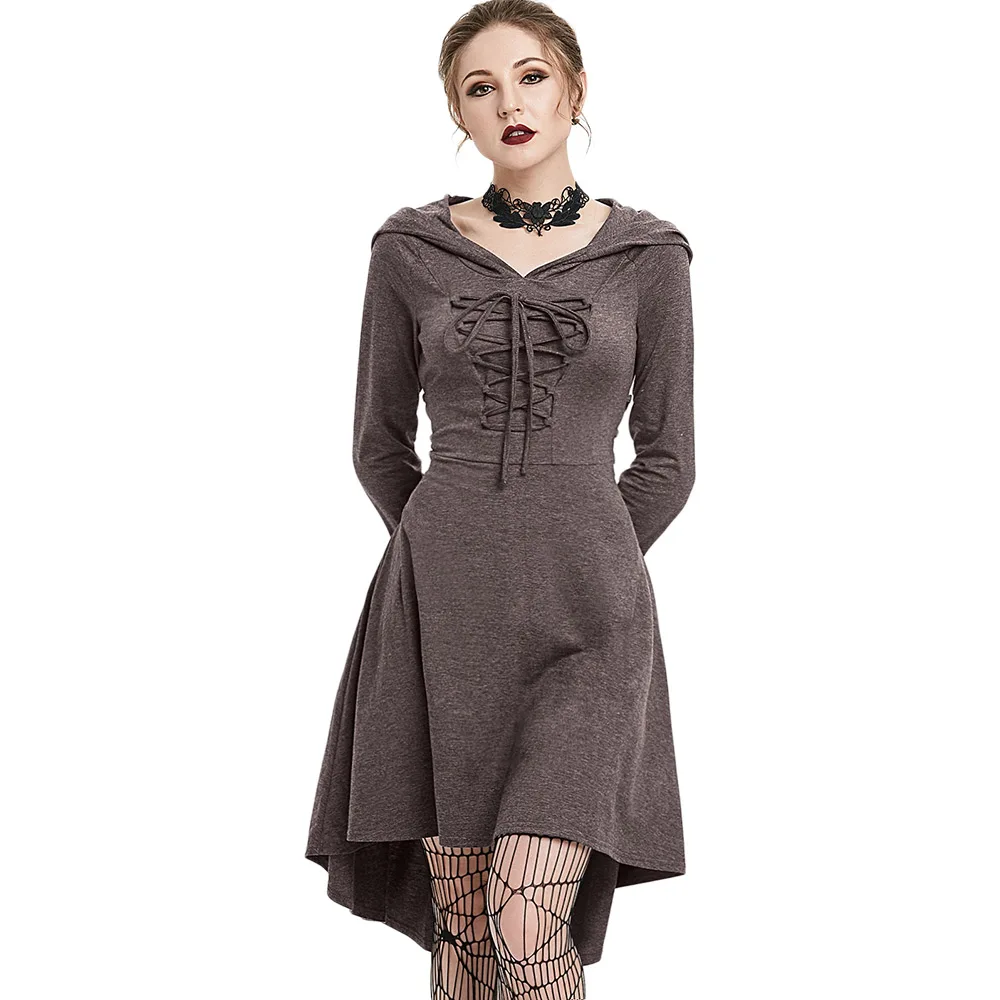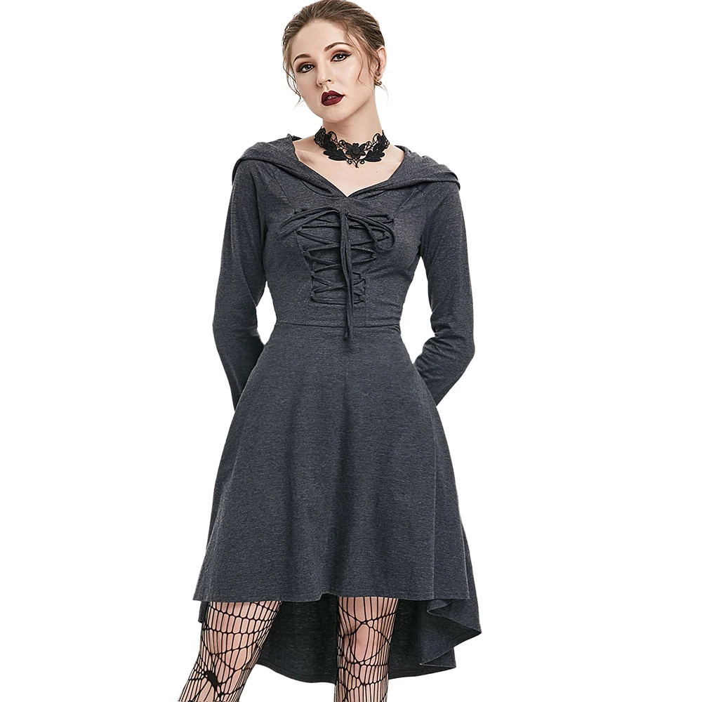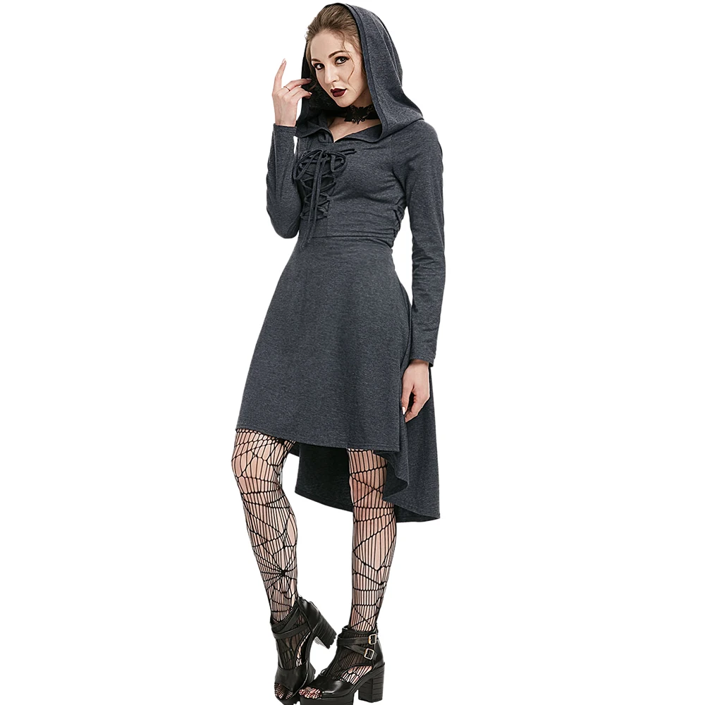 Special Offer Primavera otoño vestido gótico mujeres encapuchado Punk ropa vestidos de talla grande mujeres invierno encaje Up Heathered alto bajo vestido largo con capucha Discount 30% Today!