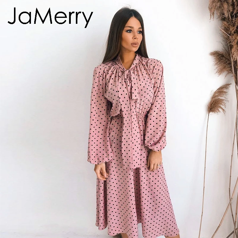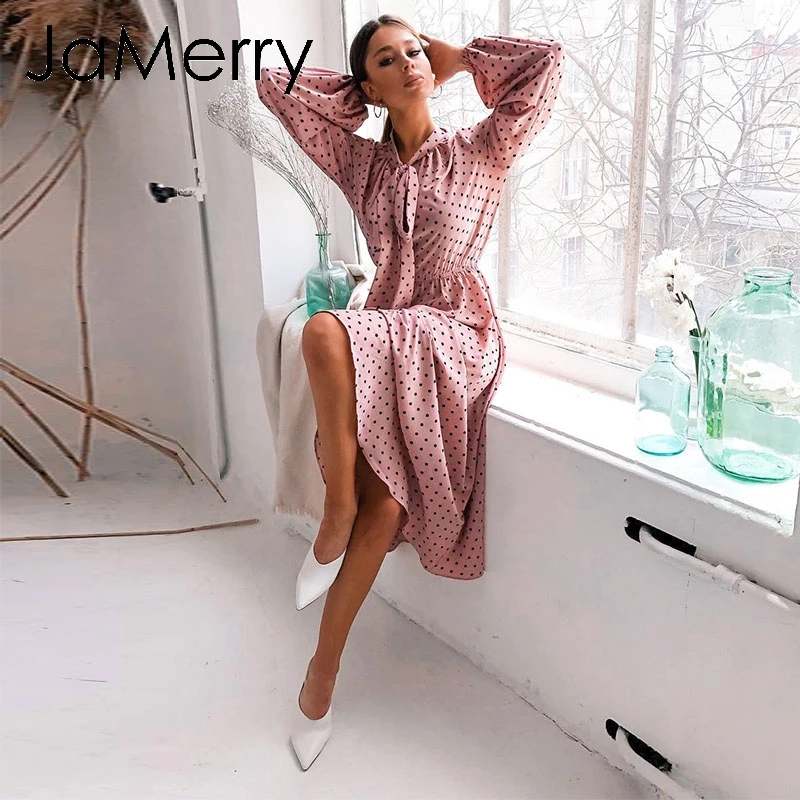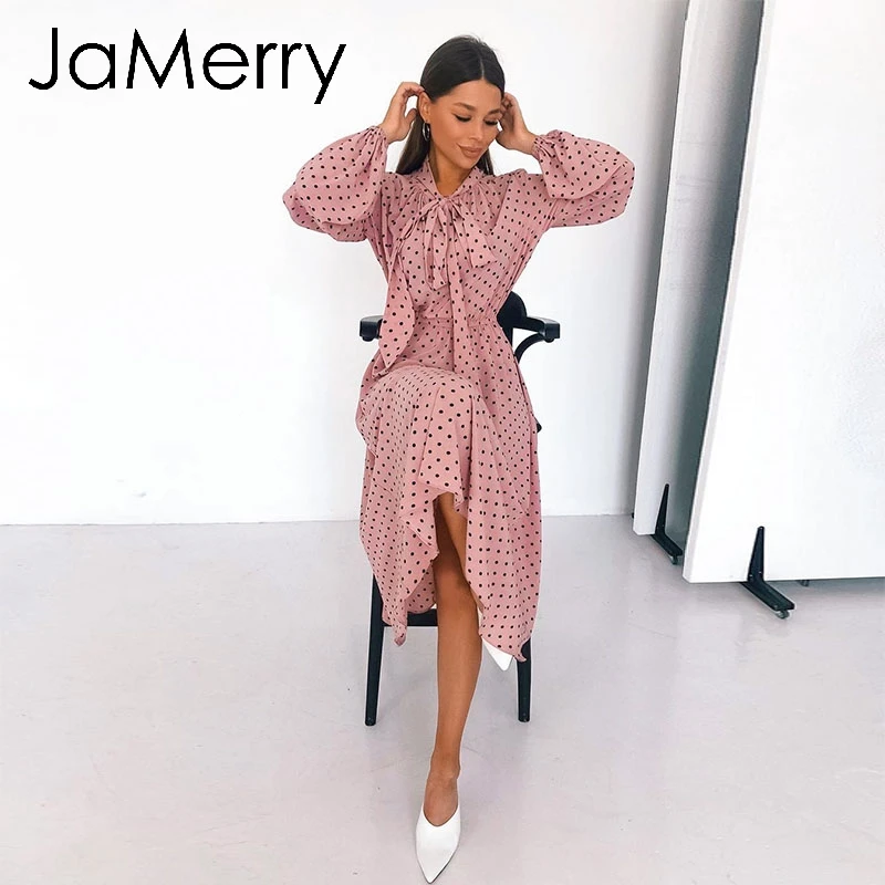 Special Offer JaMerry Vintage elegante polka dot vestido Sexy manga linterna vestido rosa suelto vacaciones otoño mujeres chic arco largo maxi vestido de fiesta Discount 40% Today!