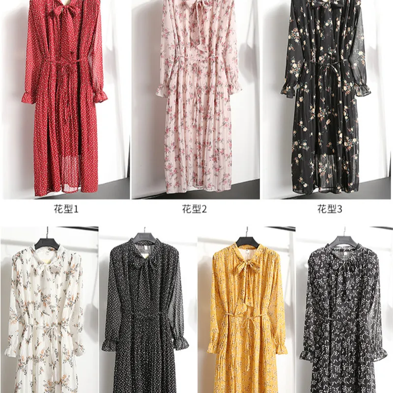 Special Offer Nuevo vestido de gasa plisado con estampado Floral para mujer 2019 primavera otoño nuevo Casual manga acampanada de encaje con cuello de lazo básicos vestidos Discount 46% Today!