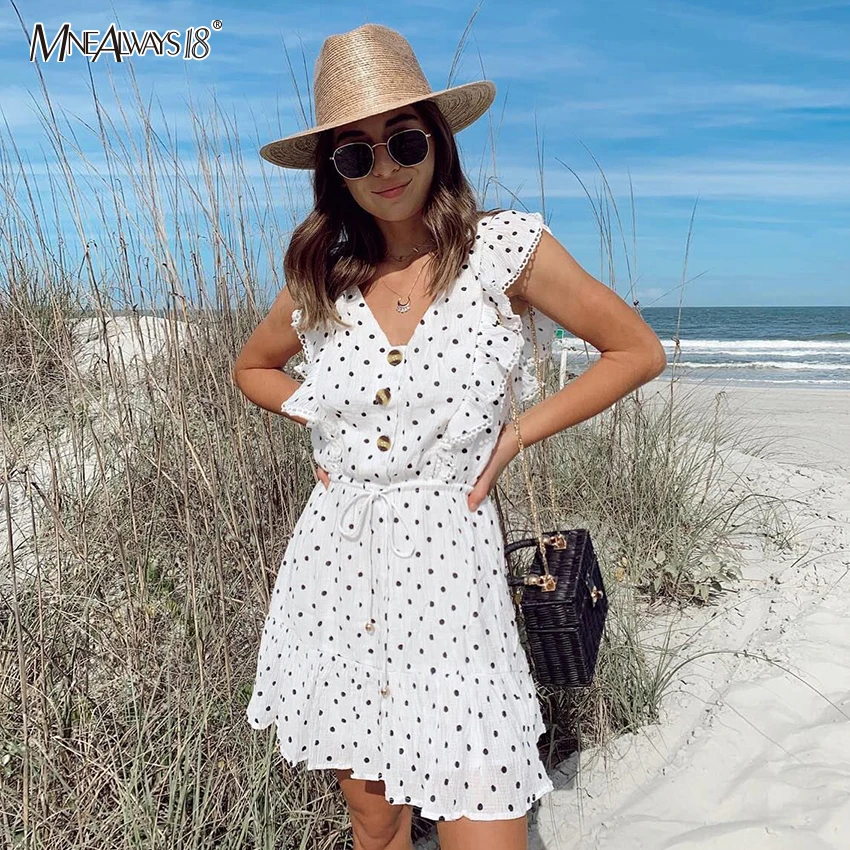 Special Offer Mnealways18 vestido de lunares con cuello en V para mujer con lazo sin espalda vestidos blancos con volantes de encaje sin mangas vestido de verano Casual para mujer Discount 54% Today!