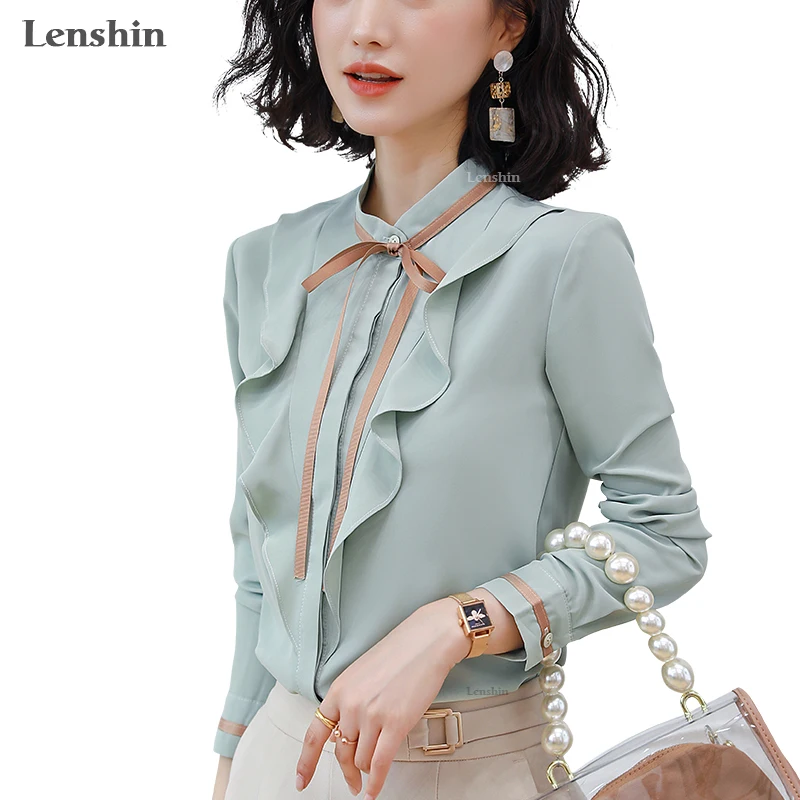 Special Offer Camisa suave y cómoda de lenespín Blusa de manga larga de alta calidad con corbata de oficina para mujer ropa de trabajo Formal parte superior verde para mujer Discount 16% Today!