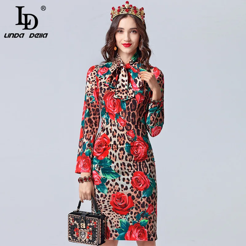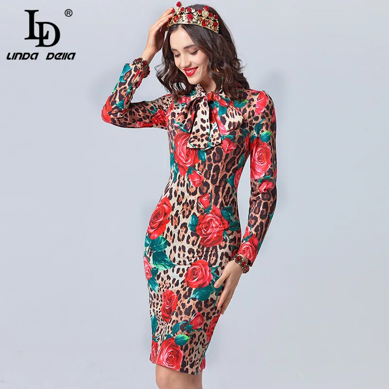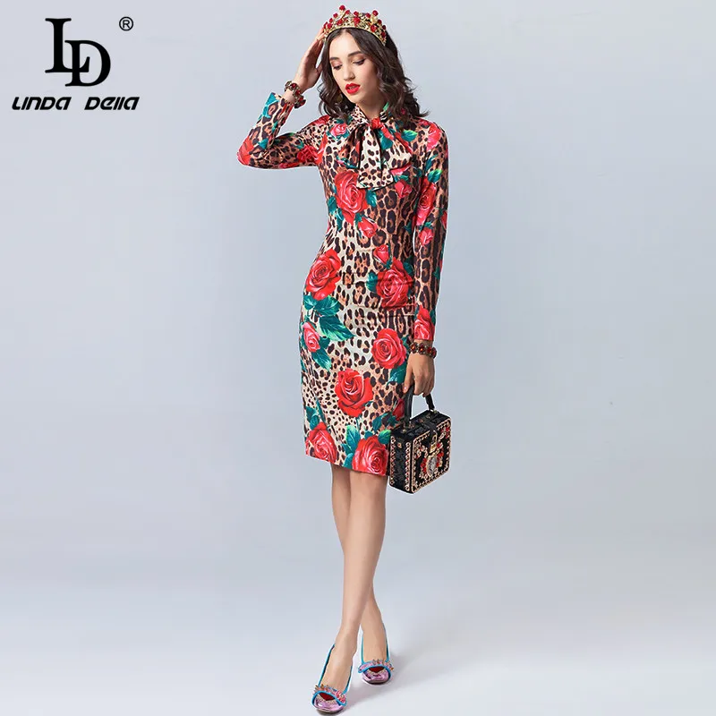 Special Offer LD LINDA de diseñador de moda vestido de Otoño de manga larga de cuello de arco de leopardo sexy impreso Rosa Floral elegante vestido 2019 Discount 25% Today!