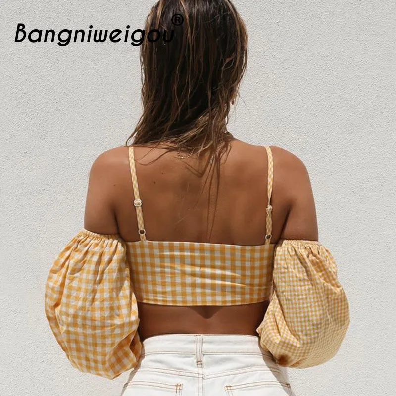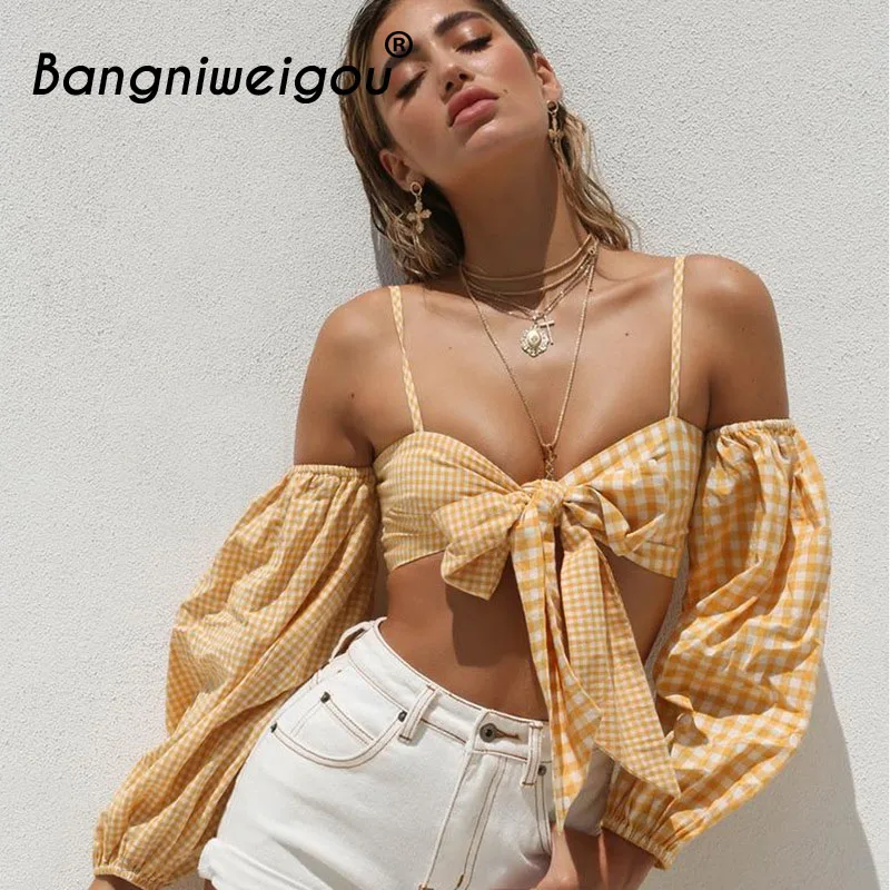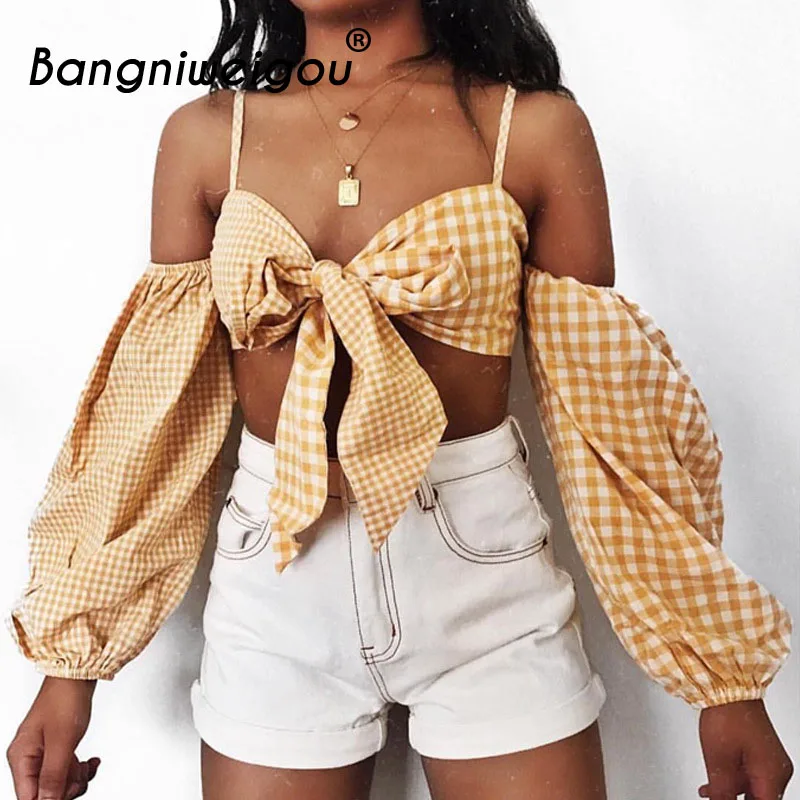 Special Offer Bangniweigou corbata Sexy camisa para mujer, chica, cuadros nudo en la parte delantera de la linterna a cuadros de manga Top camisola para mujer ropa de mujer de verano Discount 40% Today!