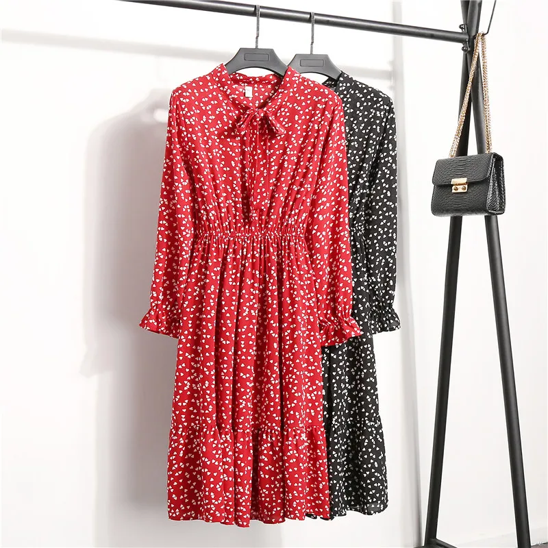 Special Offer Alta calidad otoño primavera vestidos de mujer amor cuello Floral Chiffon plisado cintura elástica Mujer Backing Flare manga vestido Discount 46% Today!