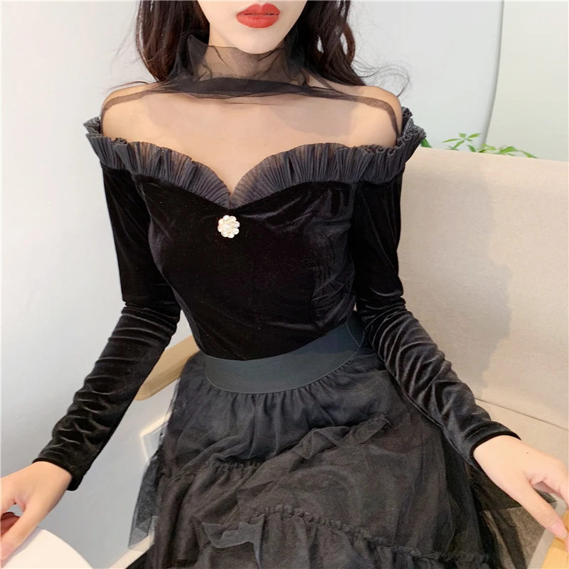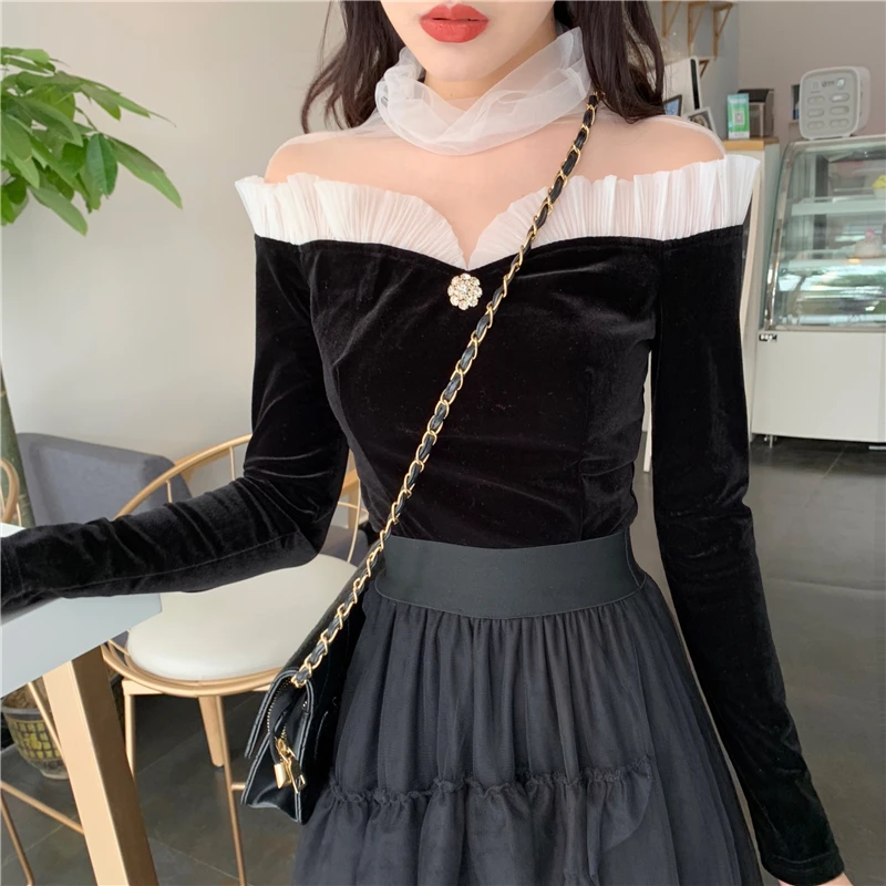Special Offer OllyMurs 2019 nuevas mujeres Vintage Velour Bottoming Shirt malla empalmado Delgado señoras blusas de manga larga de terciopelo femenino Discount 26% Today!