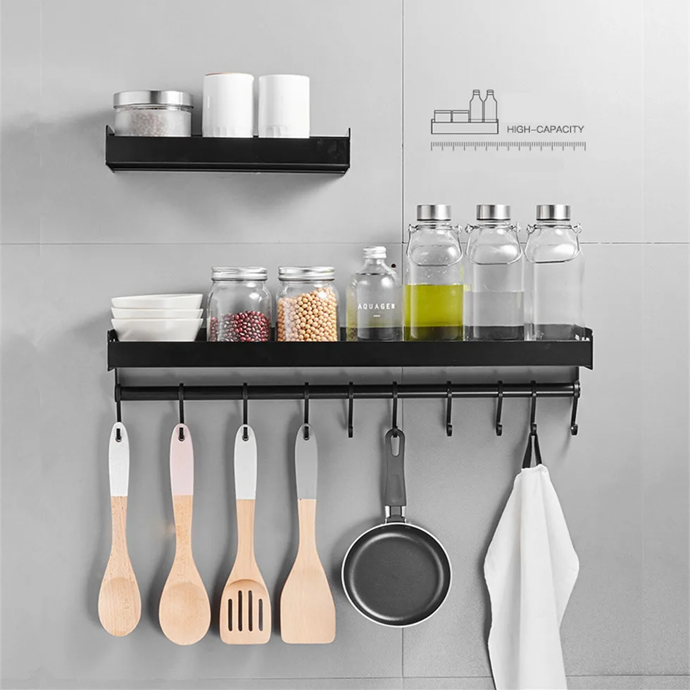 Special Offer Estante de cocina negro de aluminio gancho de drenaje botella de condimento montado en la pared multifunción despensa almacenamiento hogar 30cm 40cm 50cm Discount 32% Today!