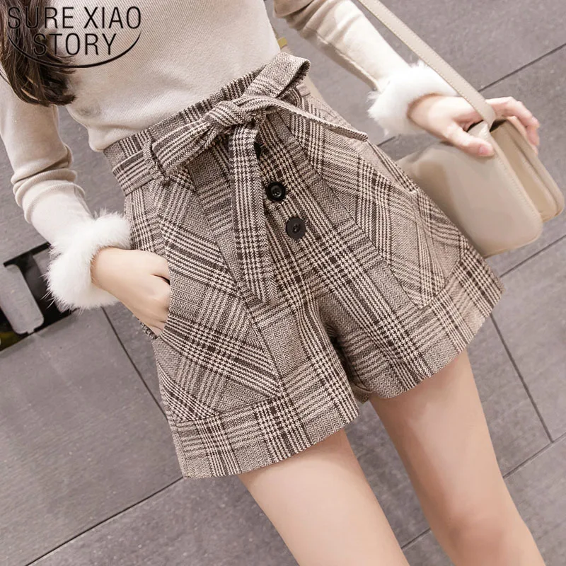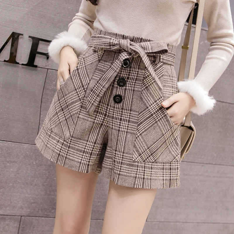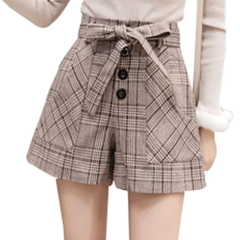 Special Offer 2019 Otoño Invierno moda mujer Pantalones cortos de cintura alta mujeres pantalones cortos Casual entramado Bow Button Shorts mujeres gris caqui 6305 50 Discount 34% Today!