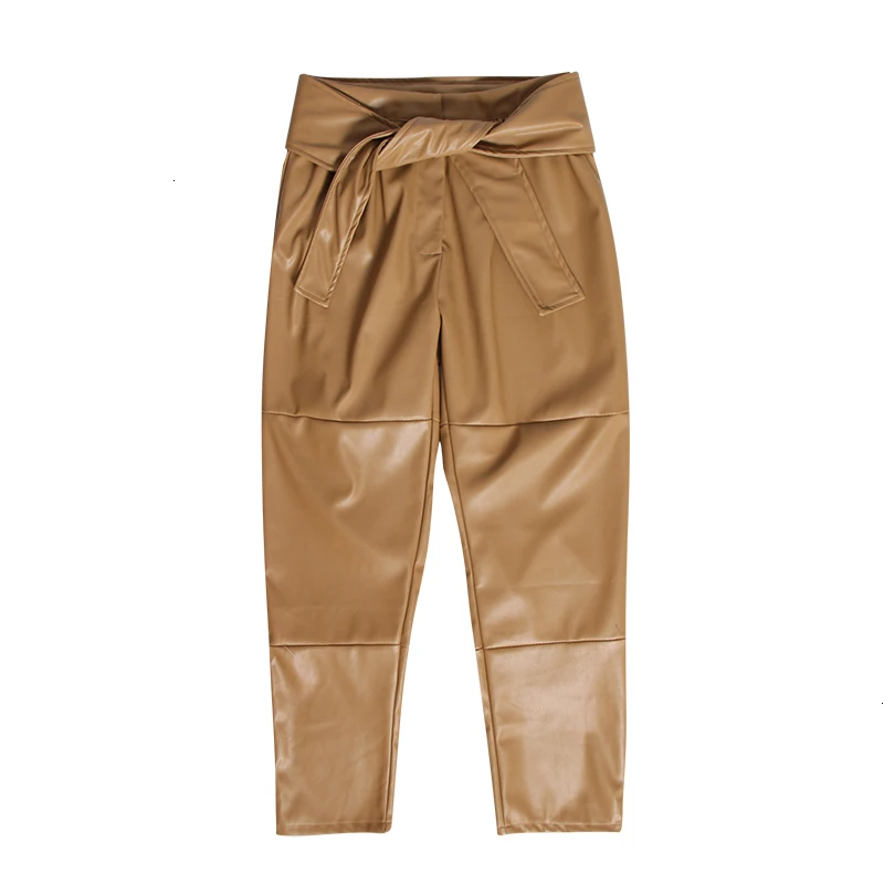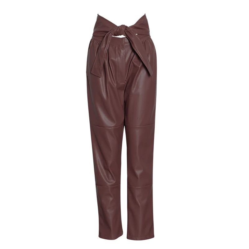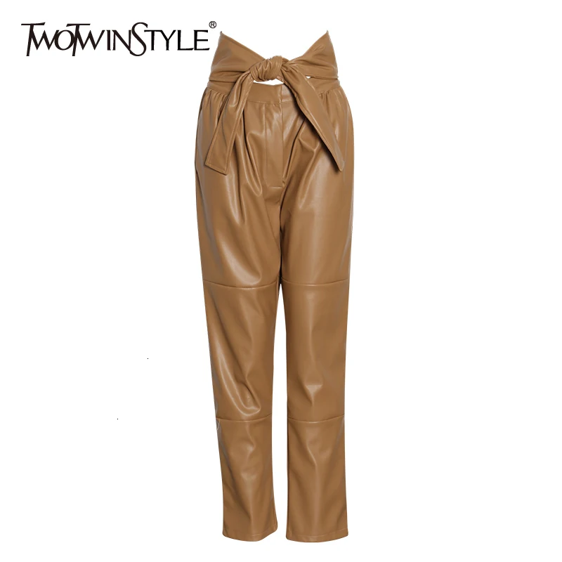 Special Offer TWOTWINSTYLE PU cuero Bowknot Mujer Pantalones de cintura alta con cordones Streetwear pantalones largos otoño moda nueva ropa 2019 Discount 39% Today!
