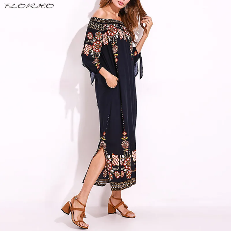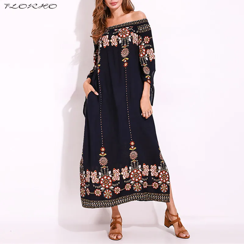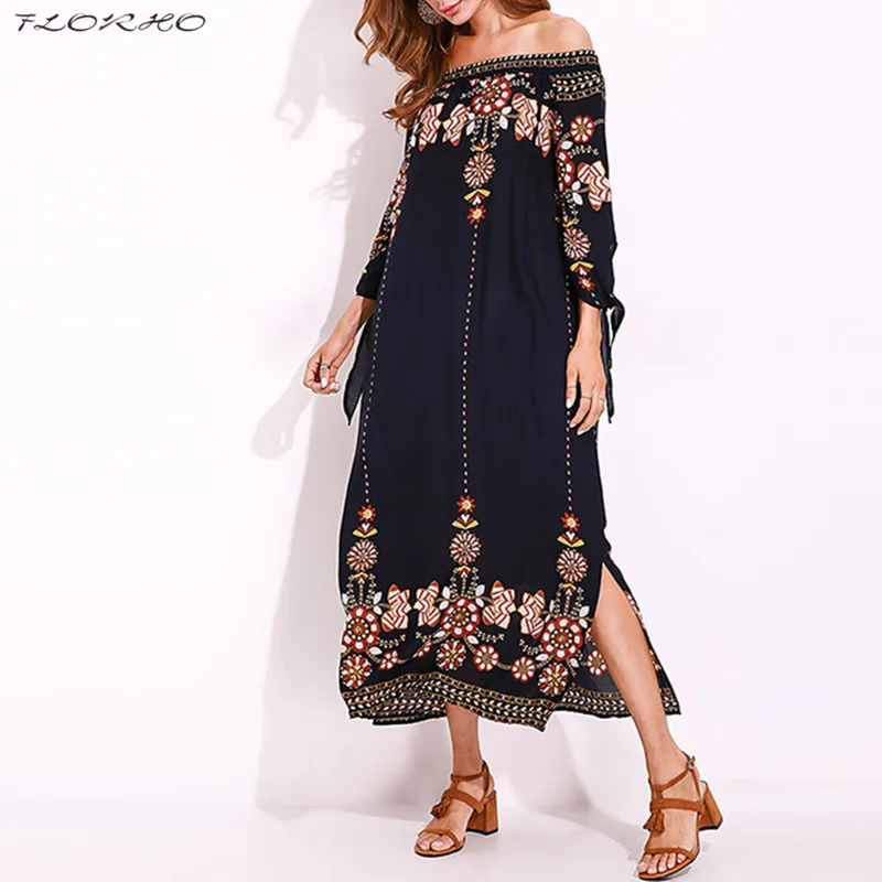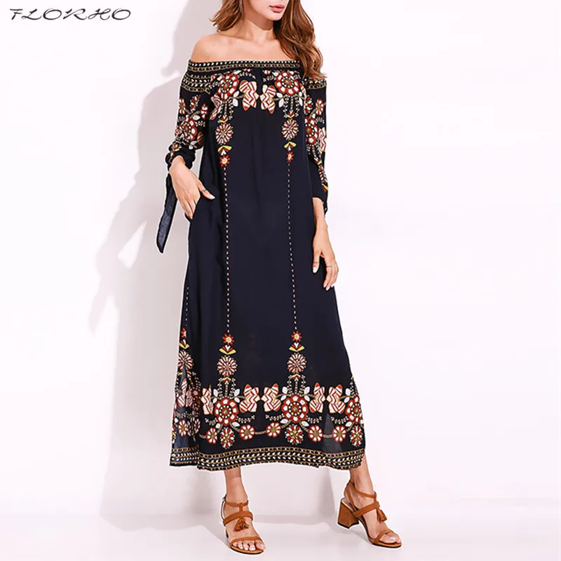 Special Offer De talla grande mujeres bohemio estampado Floral de hombro Vestido de manga larga señoras playa Vintage largo Maxi vestidos informales vestido M 5XL Discount 40% Today!