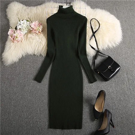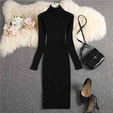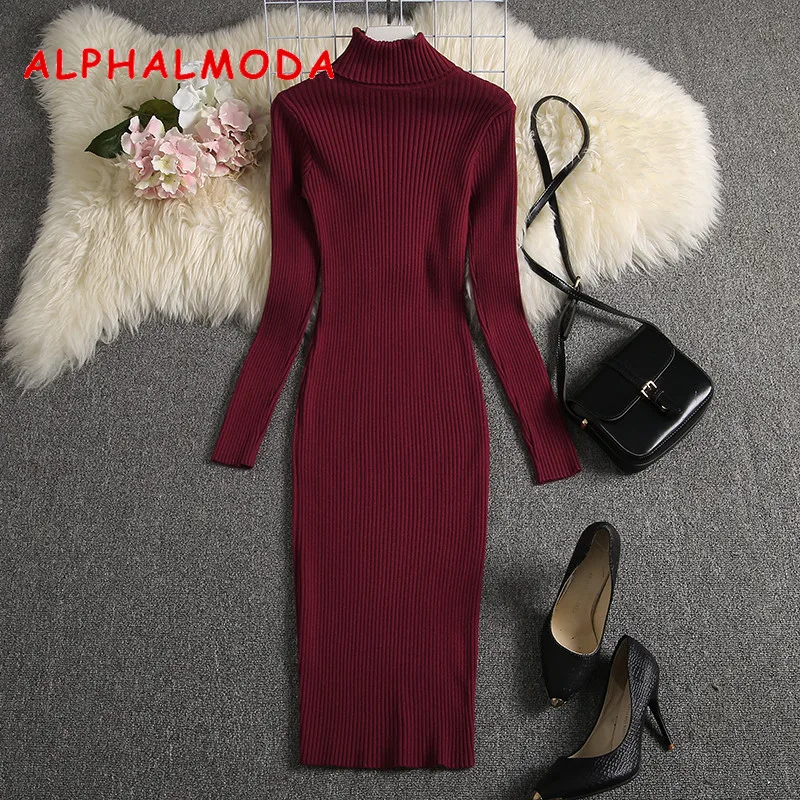 Special Offer ALPHALMODA 2019 invierno buena calidad cálido cuello de tortuga de manga larga Vestido de punto de Color sólido grueso Vestido de punto Discount 25% Today!