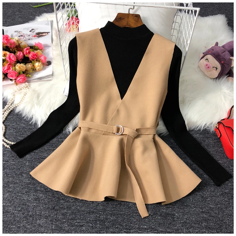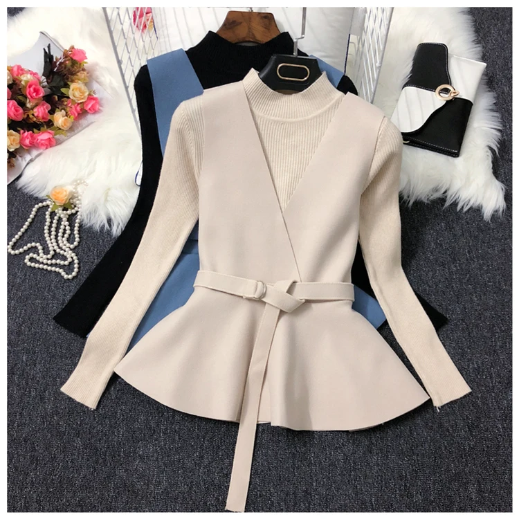 Special Offer ALPHALMODA otoño 2019 nueva camisa de parte inferior de punto + Chaleco de dos piezas traje de moda mujeres con cinturón Chaleco con cuello en V + suéter de manga larga Discount 25% Today!