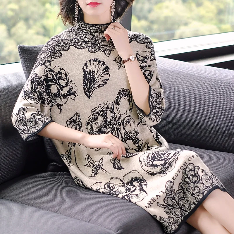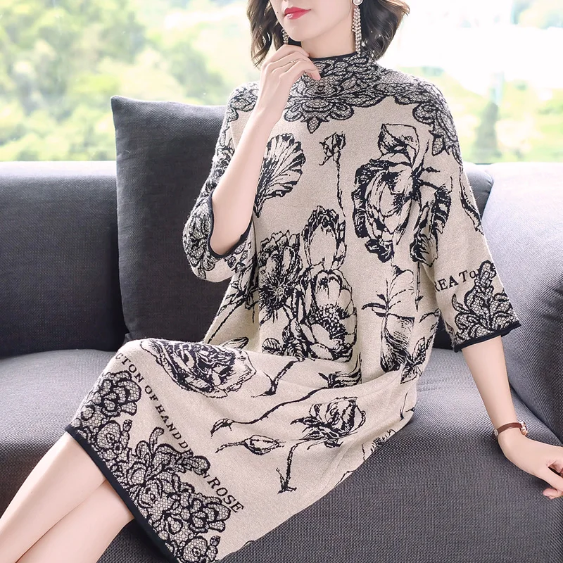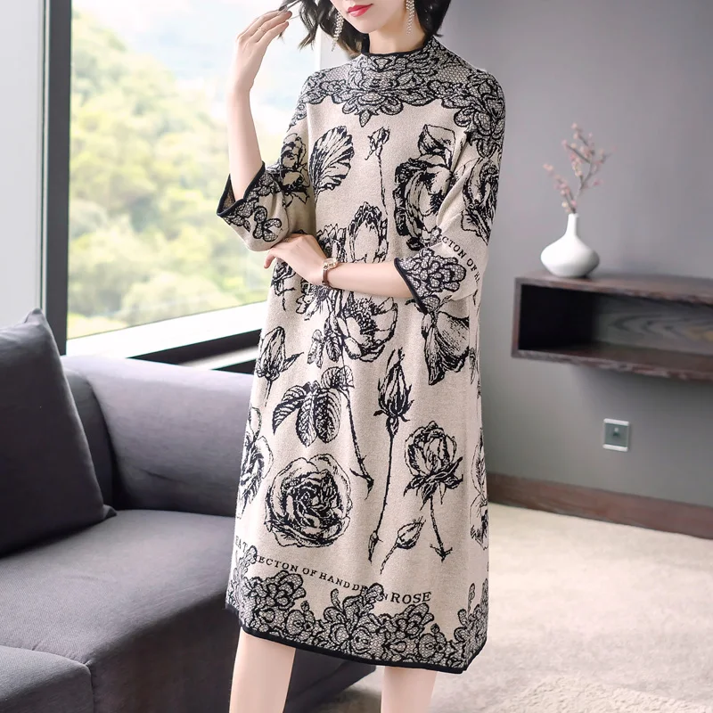 Special Offer Otoño Floral Jacquard elegante vestido de punto suelto señoras 3 4 manga suéter moda vestidos de fondo completo ropa Discount 30% Today!