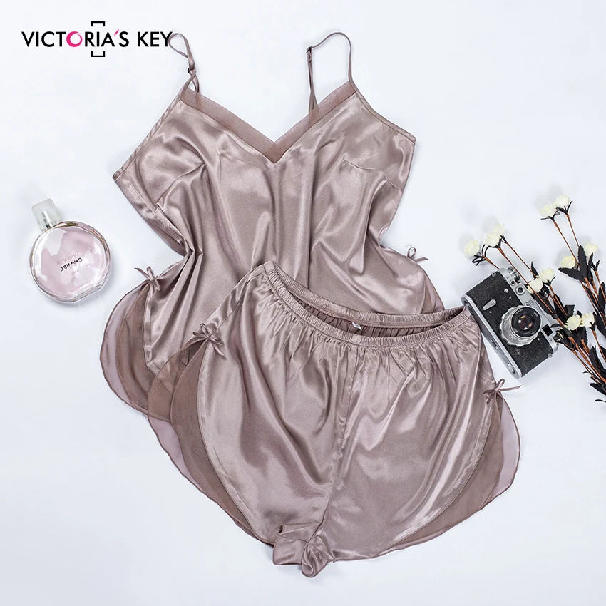 Special Offer Conjunto de pijama de satén marrón clave de VICTORIA S para mujeres sin mangas con cuello en V malla PJ señoras Cami Top Bow Tie Shorts 2019 pijamas de otoño para mujer Discount 55% Today!