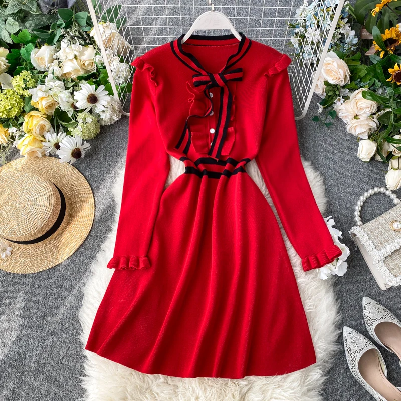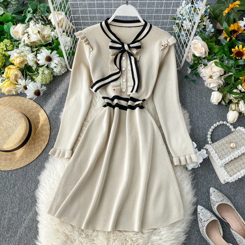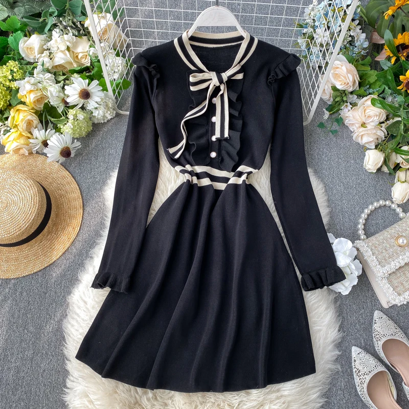 Special Offer ALPHALMODA vestido de mujer Otoño e Invierno 2019 nuevo vestido de punto a rayas con cuello con moño y mangas con volantes estilo Preppy para niñas Discount 25% Today!