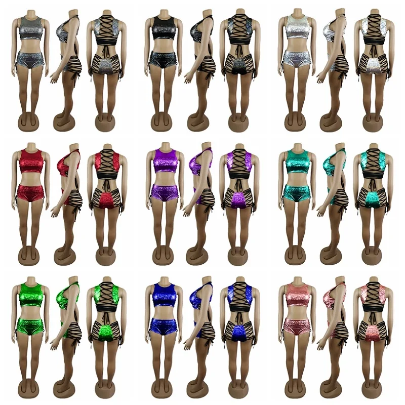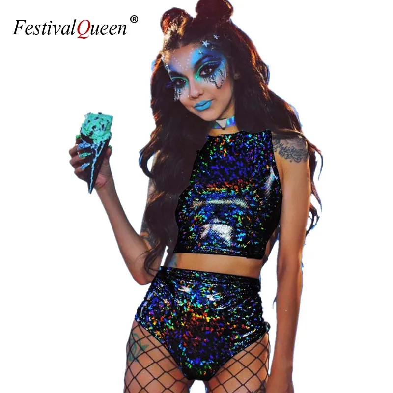 Special Offer Festival reina holográfica Crop superior y pantalones cortos calientes mujeres 2 piezas conjuntos Sexy Lace Up Festival Fiesta ropa de delirio conjunto de dos piezas Discount 40% Today!