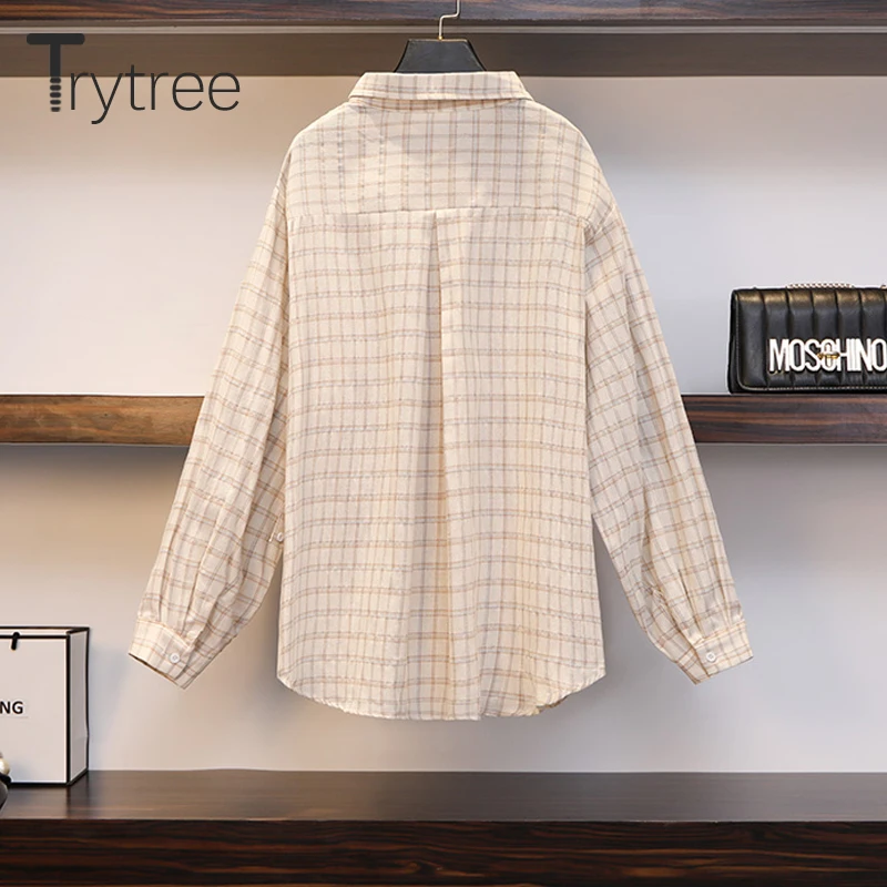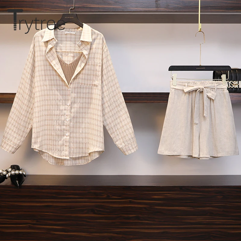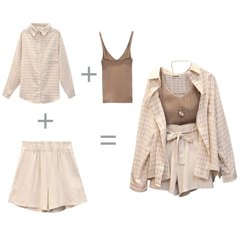 Special Offer Tritree verano otoño mujer conjuntos de tres piezas Casual Lino Plaid camisetas + Pantalones cortos cintura elástica traje con pantalones con pernera ancha Set 3 Piezas Discount 45% Today!