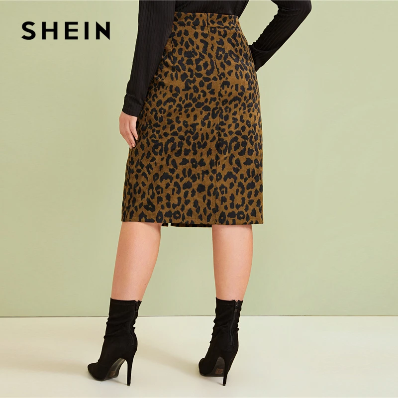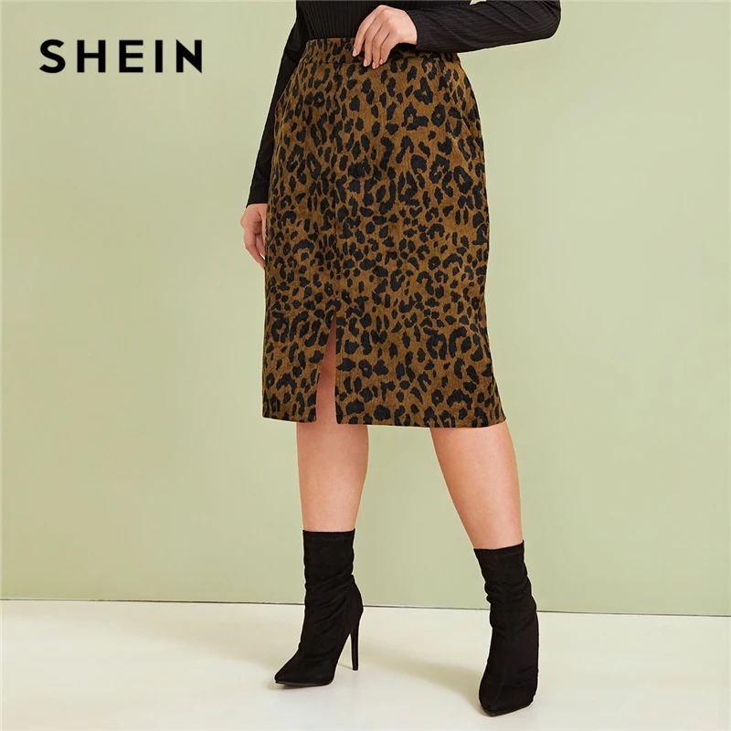 Special Offer Falda de tubo informal con abertura frontal con estampado de leopardo de talla grande de SHEIN para mujer 2019 otoño Faux Fur Glamorous Straight Midi faldas Discount 46% Today!