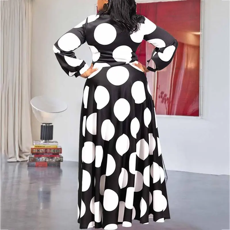 Special Offer Vestido Maxi de talla grande 5XL de gran tamaño con estampado de puntos de contraste de Color largo hasta el suelo con manga de linterna de cintura alta elegante Retro africano Discount 46% Today!