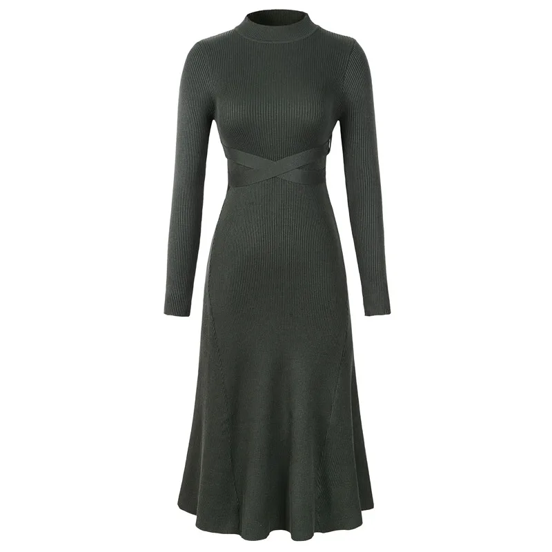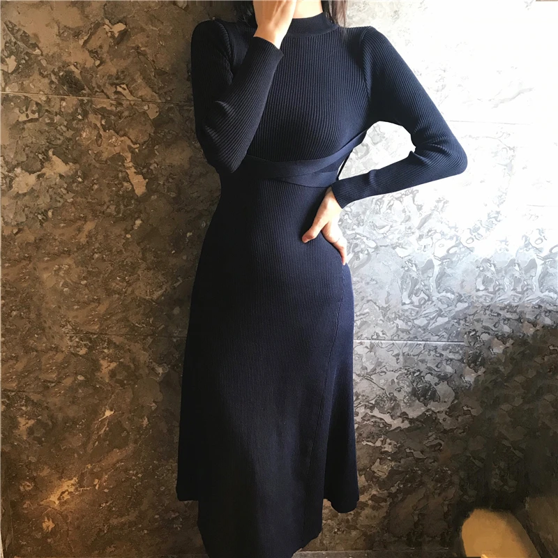 Special Offer Neophil 2019 mujer invierno tejido una línea vestidos Midi cuello redondo arco fajas manga larga Delgado Vintage señoras elegantes vestidos D2910 Discount 50% Today!