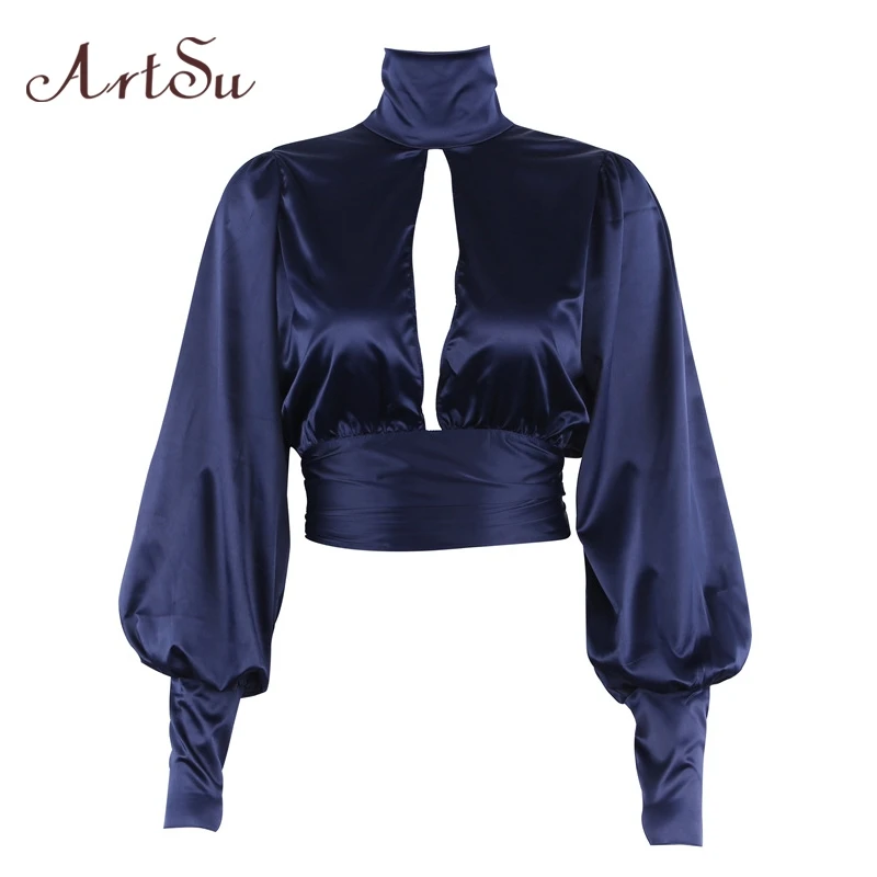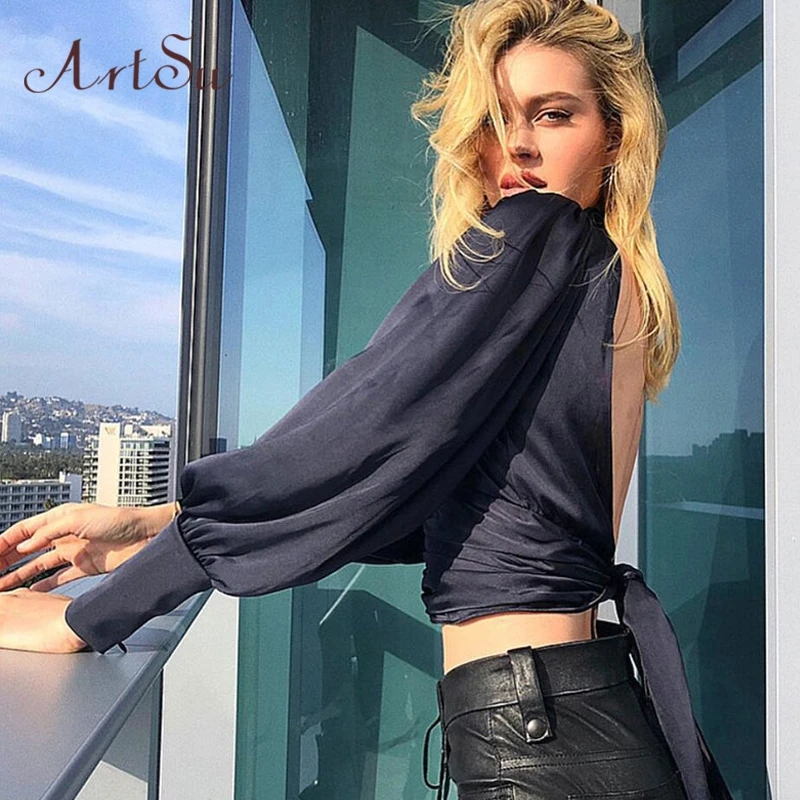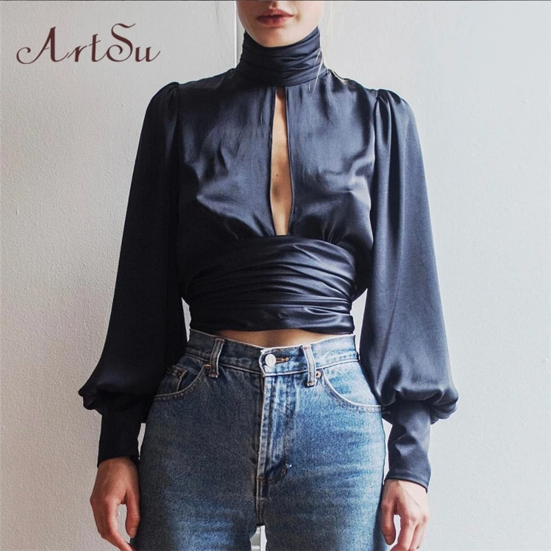 Special Offer ArtSu mujer Sexy encaje hasta arco satén blusa cuello alto Blusas sin espalda Blusas mujeres Puff manga corta superior primavera ASBL30142 Discount 51% Today!