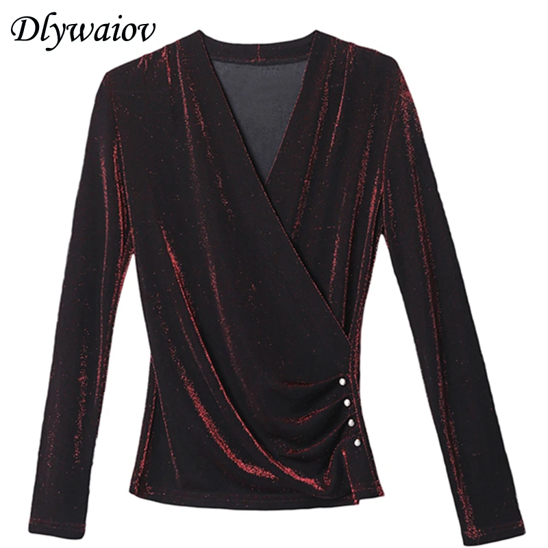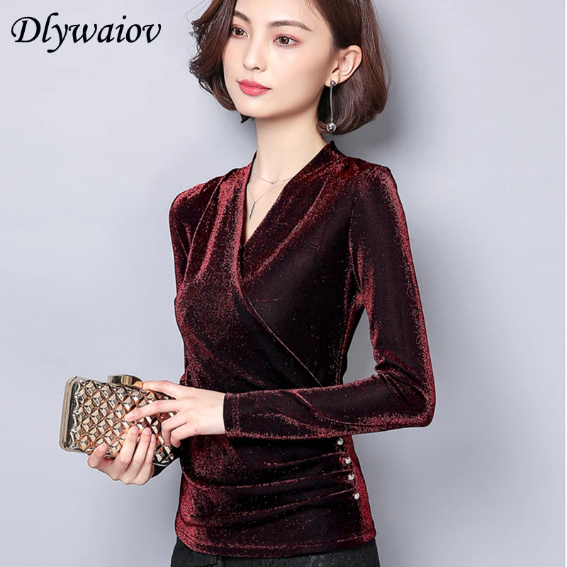 Special Offer Blusa de cuello en V para mujer moda temperamento dorado terciopelo Botón de talla grande camisas femeninas primavera coreana Bottoming camisetas de manga larga Discount 37% Today!