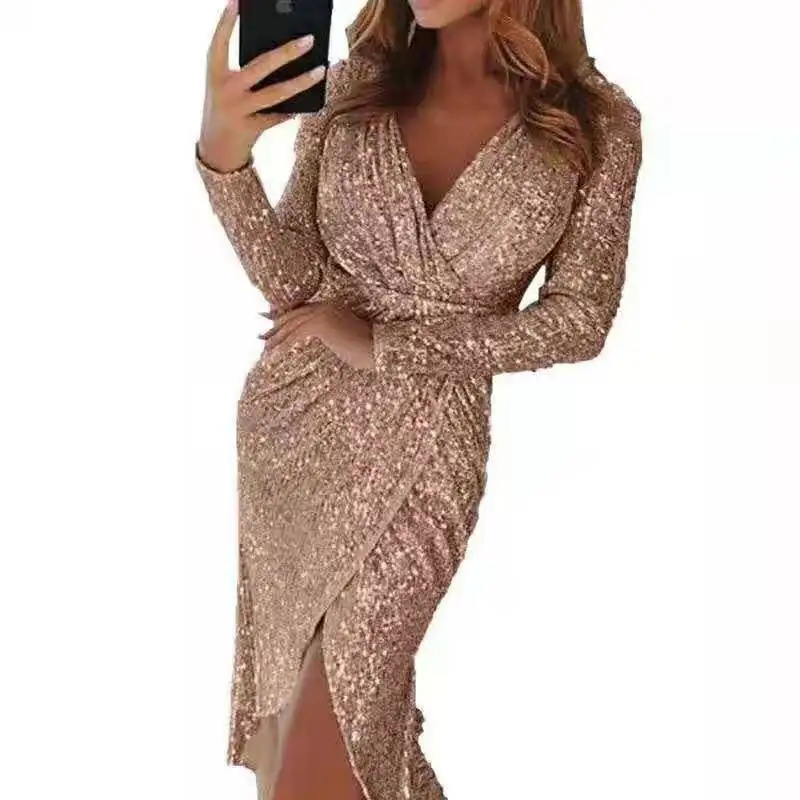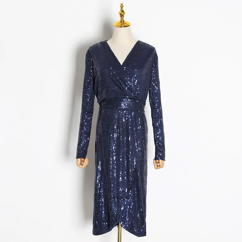 Special Offer TWOTWINSTYLE Patchwork vestidos con lentejuelas para mujer cuello en V manga larga cintura alta con fajas arco vestido derramado moda mujer marea Discount 39% Today!