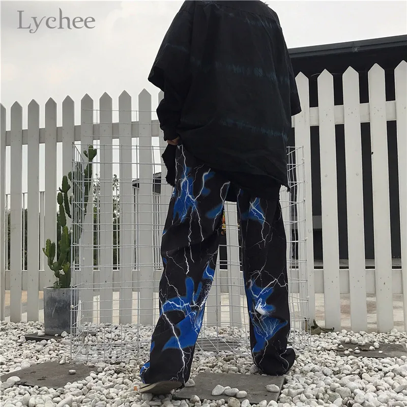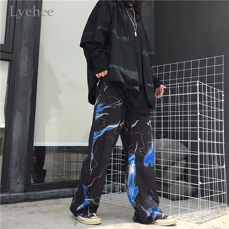 Special Offer Lychee Harajuku Lightning impresión Mujer Pantalones de fondo cintura elástica otoño señora Bottoms pantalones sueltos pierna ancha Mujer Pantalones Discount 40% Today!