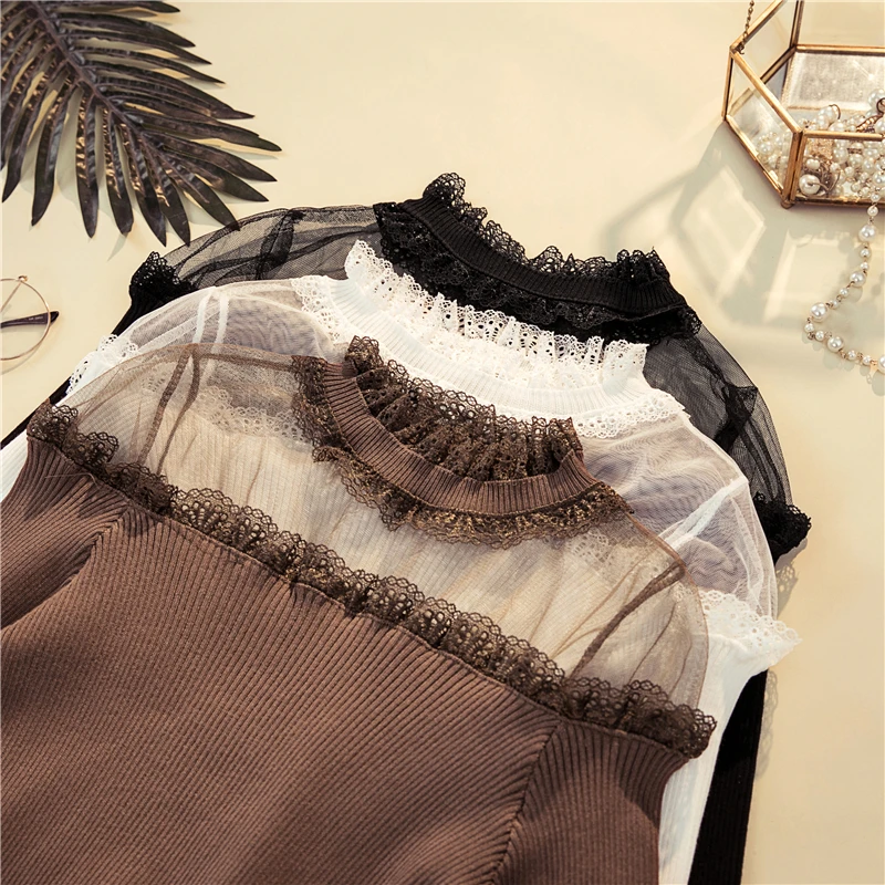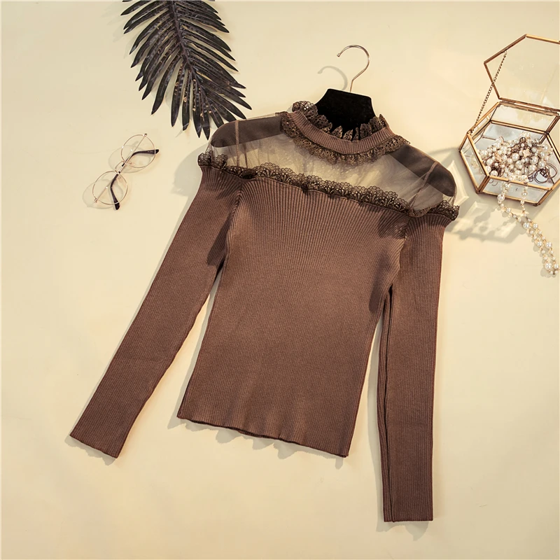 Special Offer 2019 primavera otoño nuevo encaje ahuecado Sexy ver a través de Patchwork de manga larga Delgado inferior suéter mujer moda Discount 0% Today!