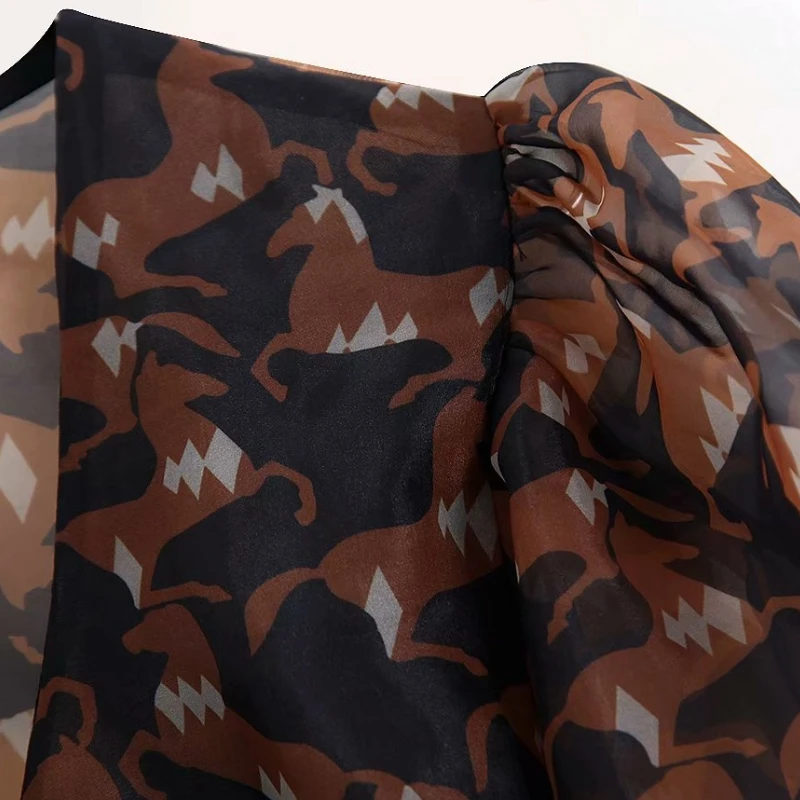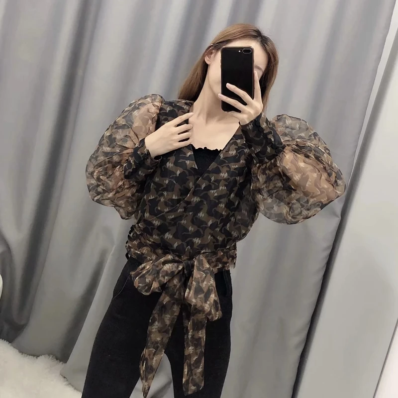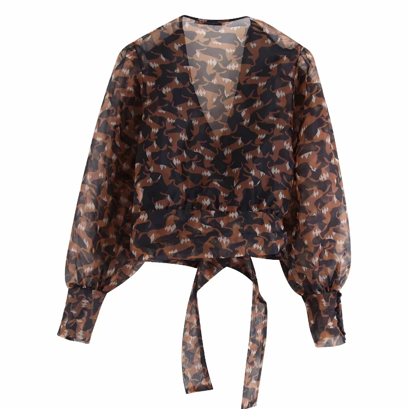 Special Offer Mujeres Cruz cuello v impresión transparente organza smock blusa camisas mujeres dobladillo atado kimono blusas retro chemise tops LS4321 Discount 0% Today!
