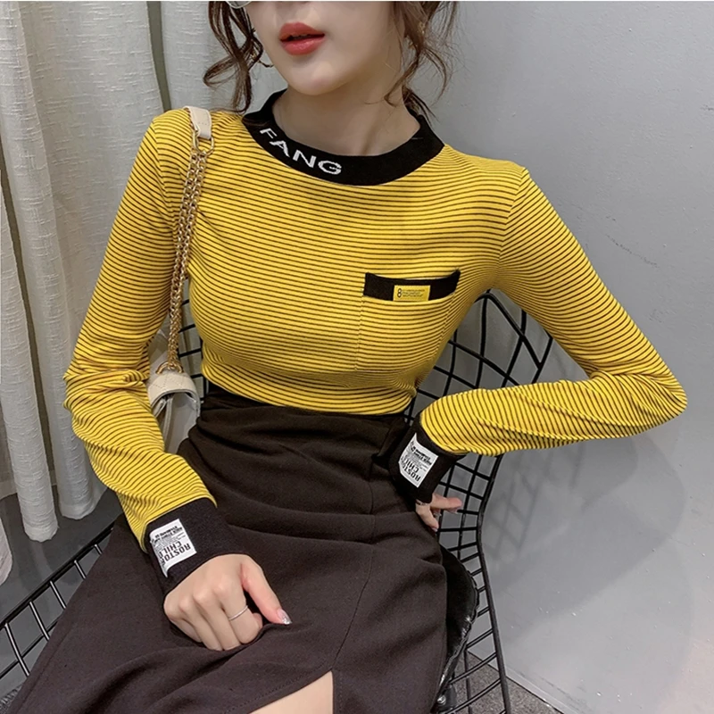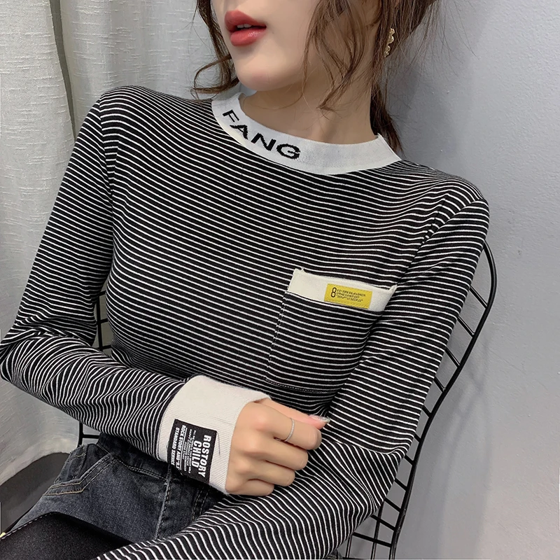 Special Offer Otoño Invierno camiseta mujer rayas letras bordado elástico grueso camiseta polar manga larga Camiseta de fondo T9N395 Discount 30% Today!