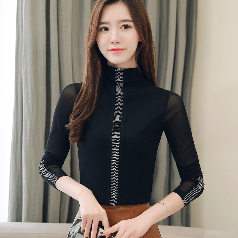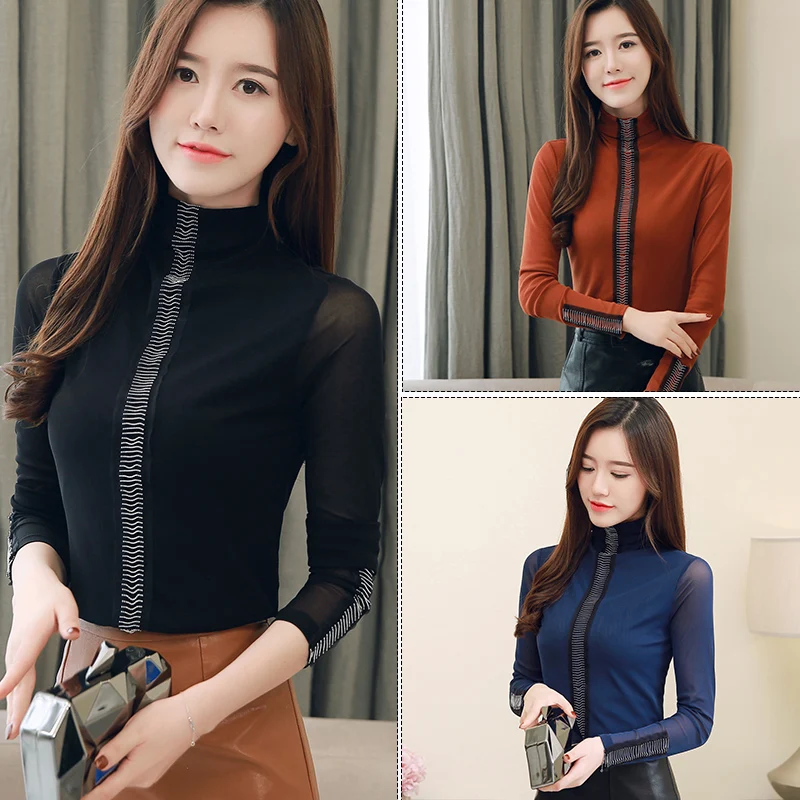 Special Offer Otoño Invierno nueva camisa delgada camisa de fondo femenina simple elegante negro manga larga caliente suéter moda costura suéter Discount 30% Today!