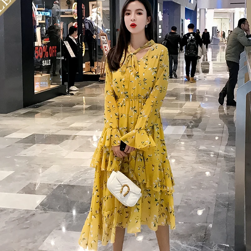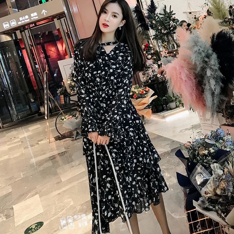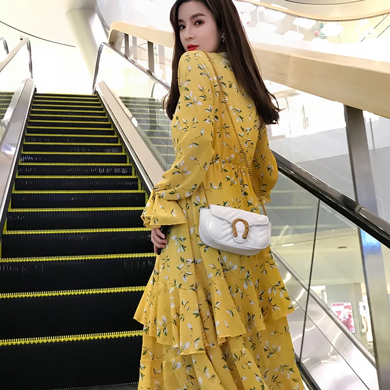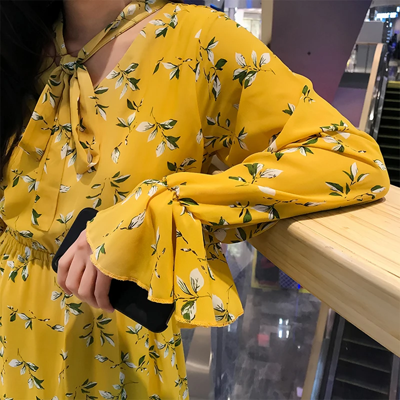 Special Offer BGTEEVER Casual volantes estampado Floral largo vestido de mujer pantalones acampanados con elástico en la cintura manga Vestidos femeninos mujer A line vestido 2019 Discount 40% Today!
