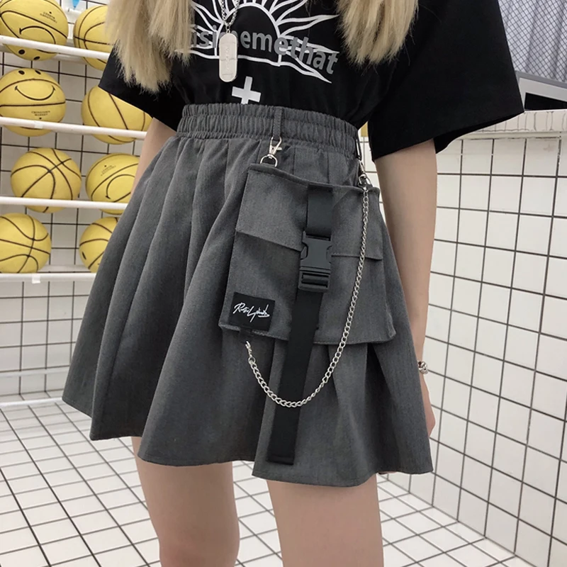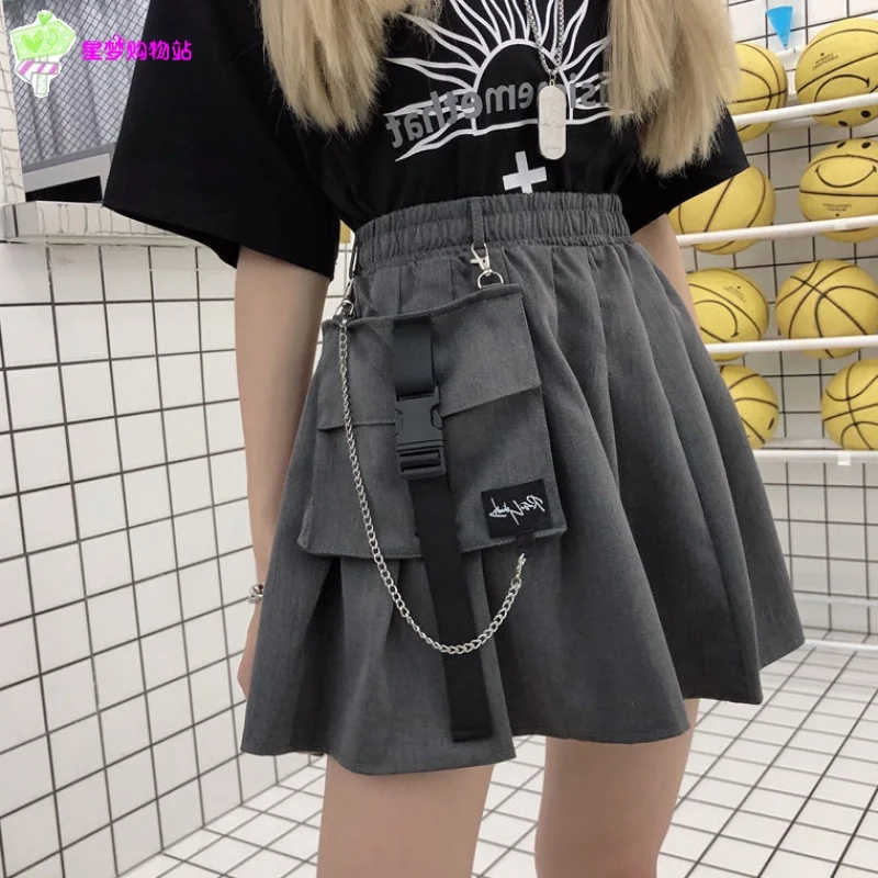 Special Offer Nuevas faldas para mujer moda Otoño Falda corta para mujer plisada falda para la escuela bolsillo suelto alta cintura Metal cadena 2019 verano Bottoms Discount 40% Today!